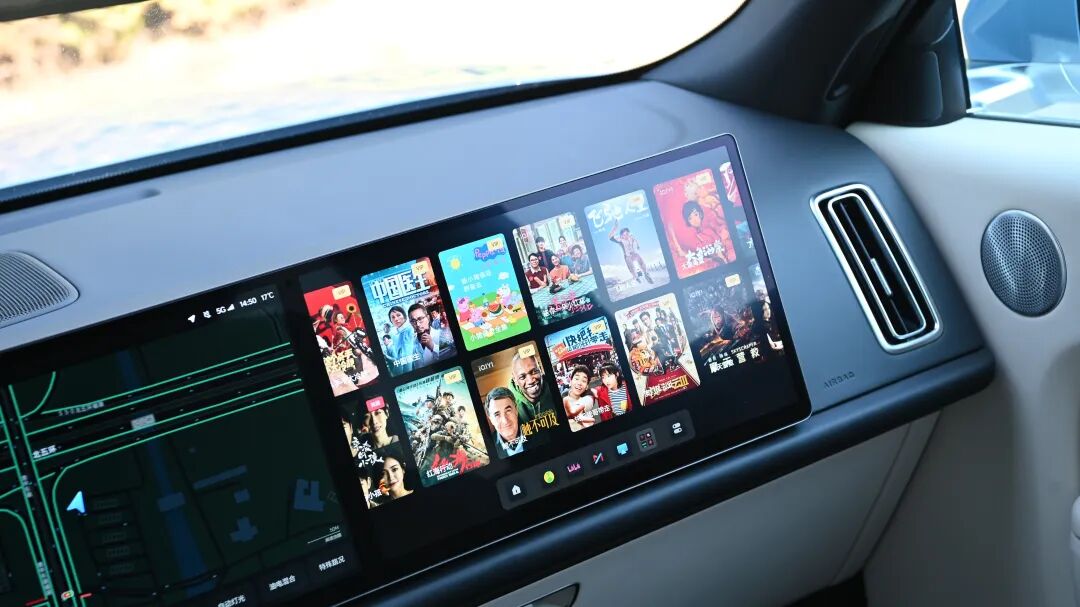双15.7英寸悬浮式触控大屏,视觉效果非常出彩,屏占比和屏幕显示效果都没得挑,中控大屏集成了在线导航、车辆设置、第三方音乐等功能,副驾驶前方屏幕更多的是起到娱乐作用。