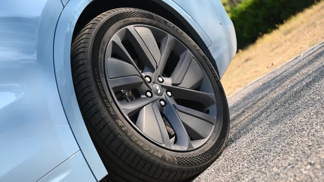 新车侧面造型较为常规,隐藏式电动门把手和与车身同色的轮眉给人较为简洁的视觉感受,20英寸低风阻枪灰色轮圈造型较为美观,在轮胎配置上实拍车型采用来自米其林的PILOT SPORT 4系列,规格为255/50 R20。在尺寸上新车的长度达到5080mm、宽度达到1995mm、轴距为3005mm,即便是放在中大型SUV中,这样的尺寸数据也算得上是较为突出的水平。