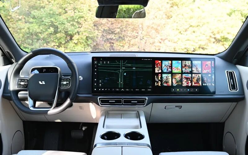 理想L8和L9的整体内饰设计也保持高度一致,没有传统仪表盘显得中控台更加规整,方向盘上方集成了小尺寸触控屏幕用来显示时速、挡位、续航里程等关键信息,只不过在打方向时,屏幕会随之旋转需要一定的适应时间。在用料上能触摸到的地方基本上采用细腻的皮质包覆,配合上空调出风口等处的金属材质点缀,高级感较为突出。