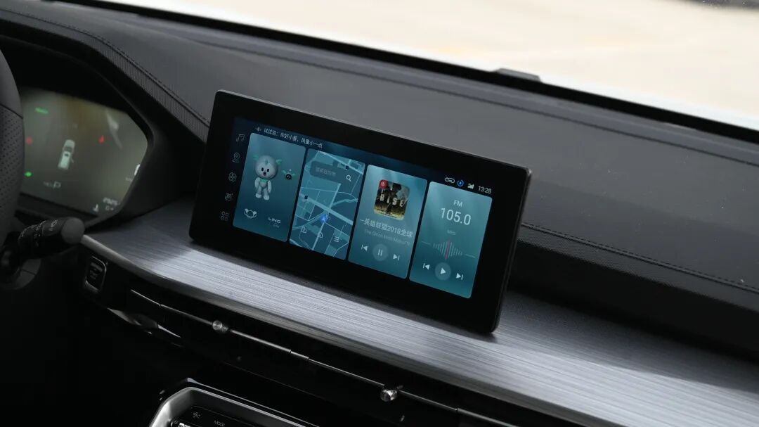 中央的悬浮式屏幕尺寸为10.25英寸,屏幕分辨率较高,显示效果较为细腻,Ling OS灵犀系统操作较为流畅,卡片化菜单布局易上手,在功能性上高德地图、车联网、第三方音乐、语音控制都没有缺席。下方的空调控制区域采用拨片、按键操作,高级感和实用性都能够兼顾。