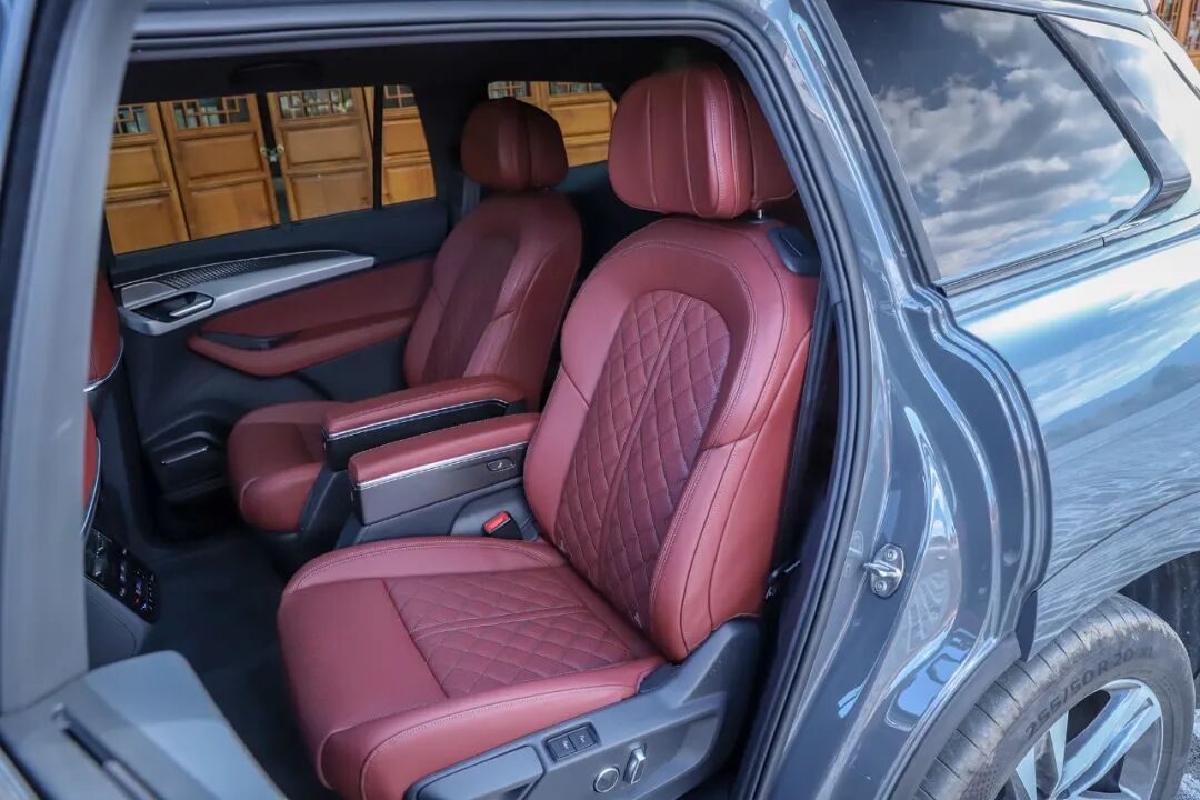 2.5T车型采用6座布局,第二排两个独立座椅配备有扶手、杯架、靠背角度电动调节以及加热、通风、按摩功能,舒适性配置可谓是非常到位。