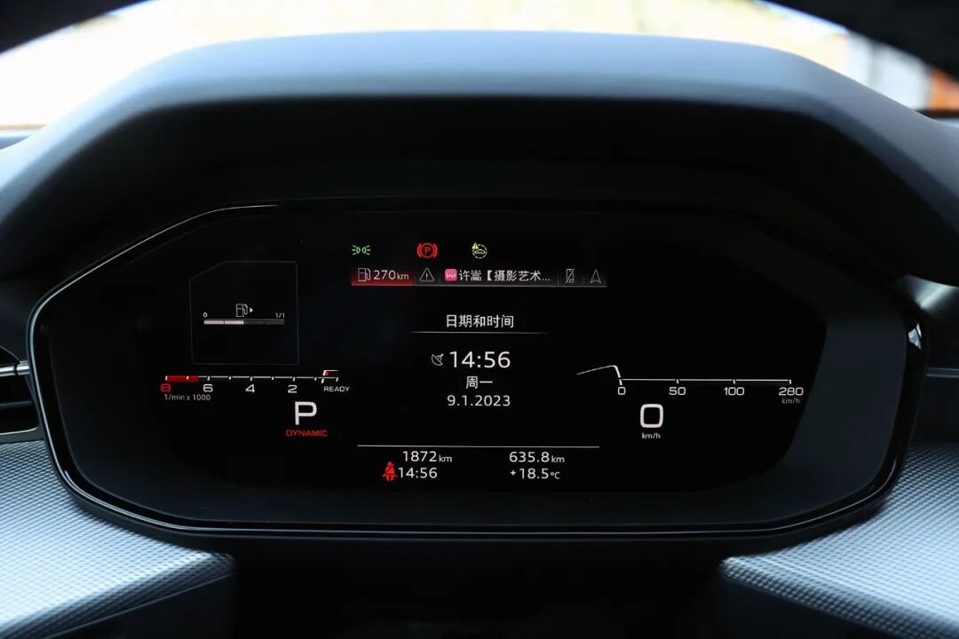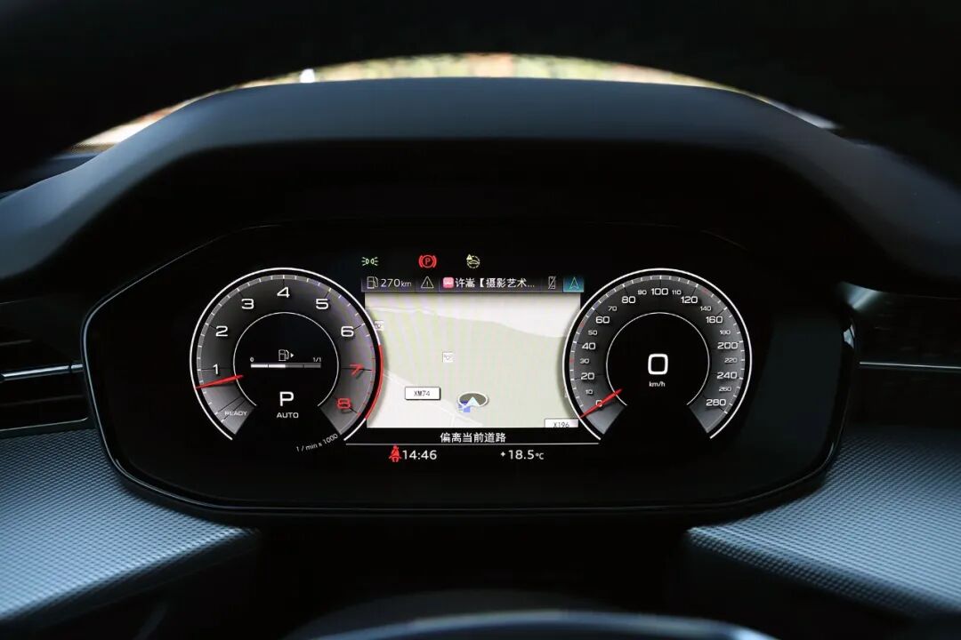 12.3英寸全液晶仪表的界面UI是标准的奥迪风格,深邃且不乏科技感。除常规行驶数据,还可显示导航、媒体源、驾驶辅助等内容。此外,仪表盘还支持经典、S性能、动态三种显示风格。
