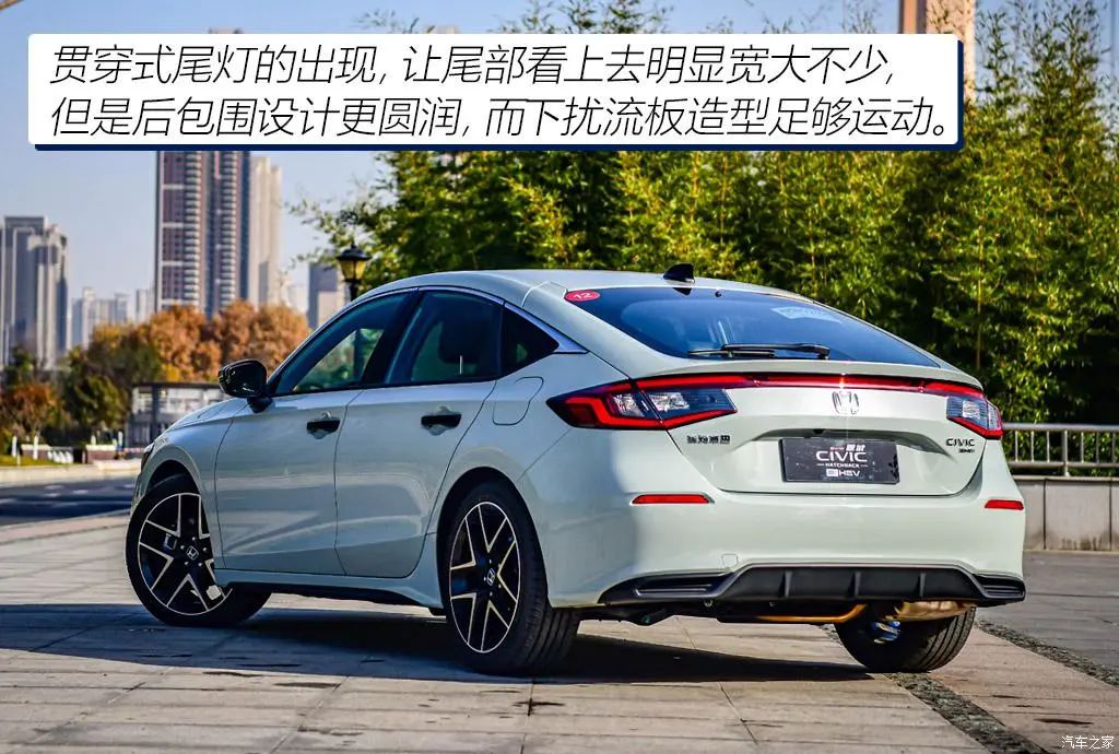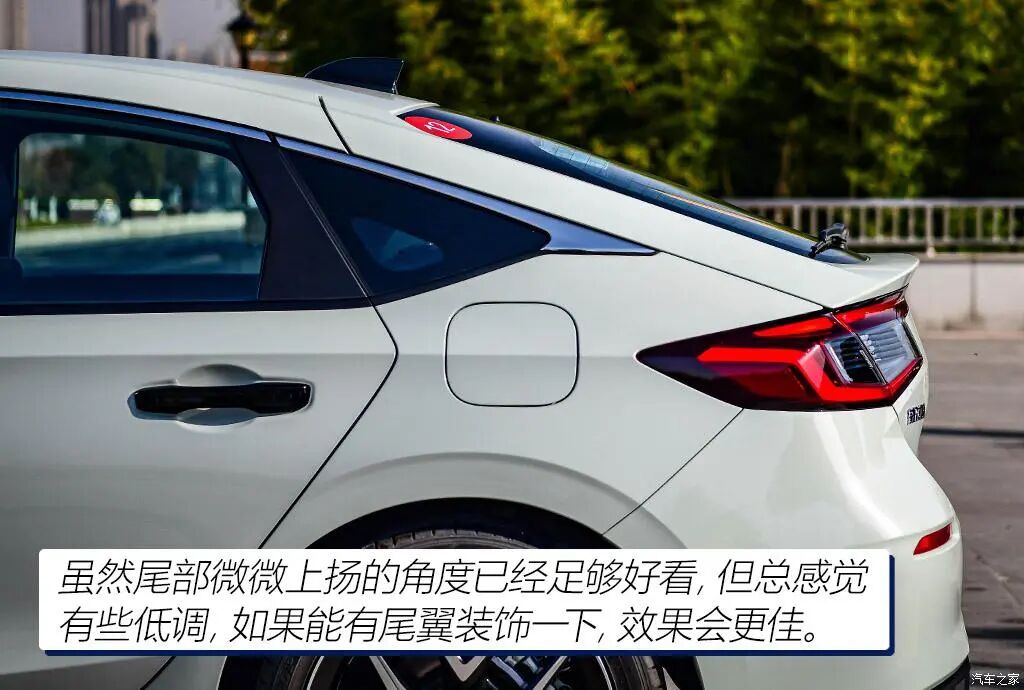 尾部的设计与三厢车型有着明显区别,贯穿式尾灯的出现让车尾显得宽大不少,但是后包围设计明显圆润许多,没有过多的线条修饰缺乏了一些立体感。但是下扰流板与三厢车型相比,明显夸张了不少。实拍车型为混动版本,所以两侧排气尾喉都为隐藏式布局,1.5T燃油车型则保留了双边共两出的排气布局。