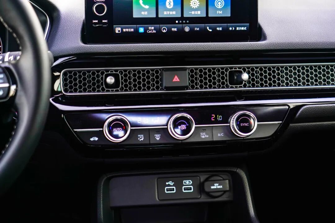 方向盘造型很日系,且与思域毫无二致,多功能按键周围使用了亮黑色饰板点缀,下方为金属质感镂空饰条,内侧依旧为银白色缝线,精致感毋庸置疑。