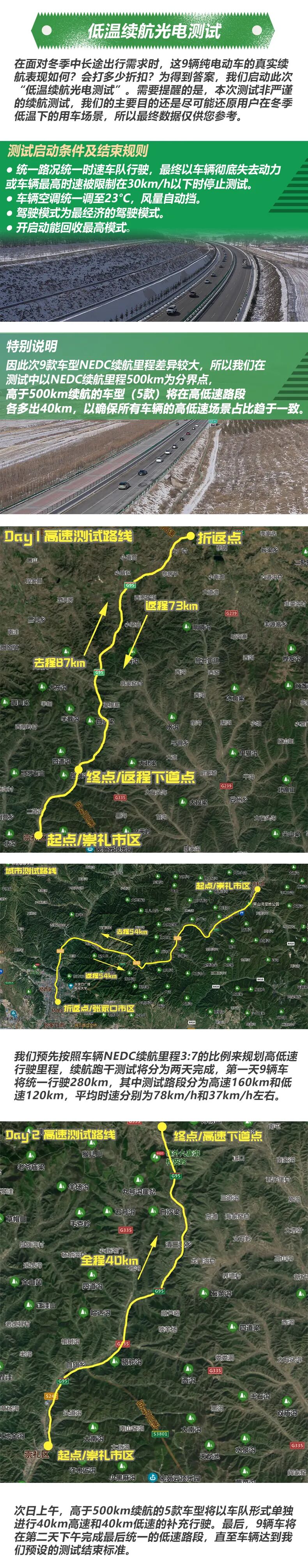 以上就是关于“低温环境加速测试”和“低温续航光电测试”的内容了。零下的气温环境并不会对车辆加速性能产生明显的负面影响,这点大可放心;上坡路段、低温确实会对车辆能耗造成影响,路线规划很重要;表显剩余续航里程为0km后,还能行驶10km左右或以上,最高车速被限制在50km/h以下甚至更低时,就要抓紧找安全区域停车了,大意不得。