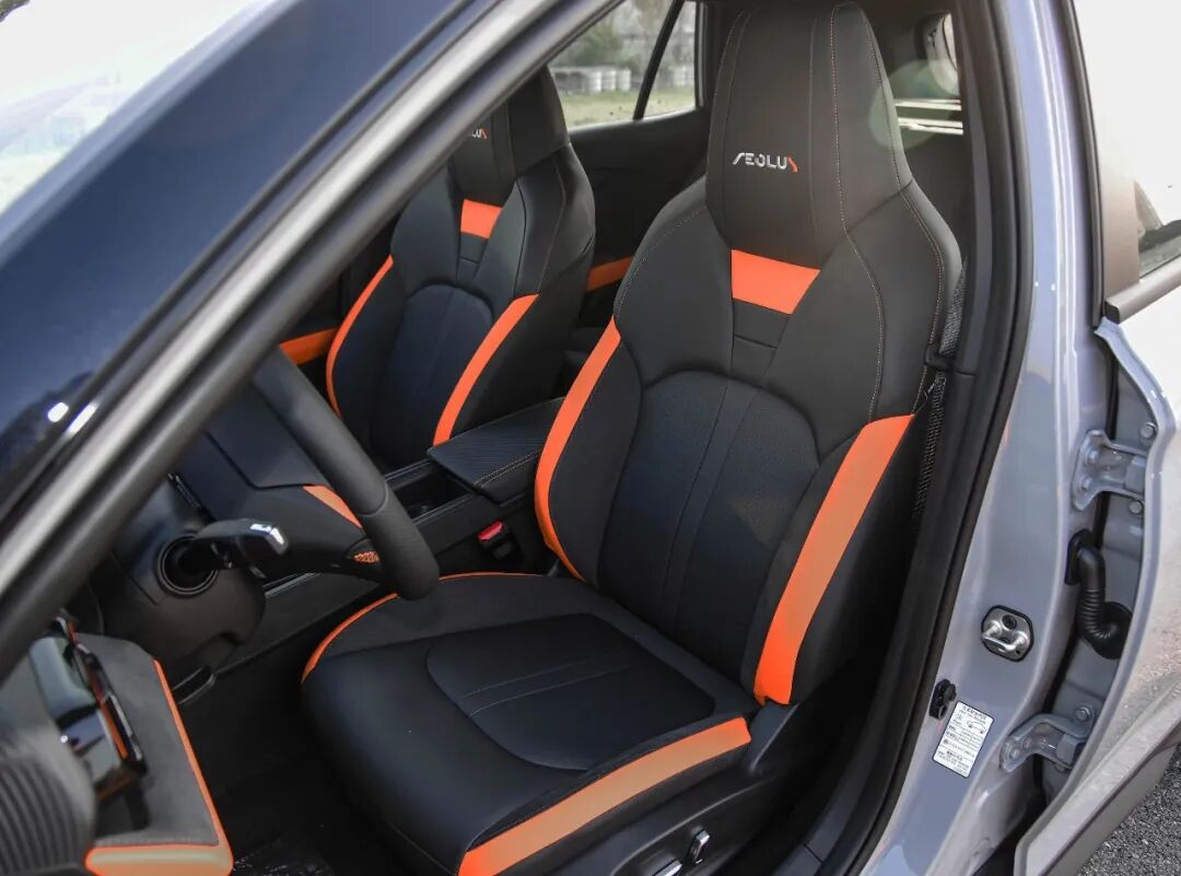 前排座椅采用一体式设计并附有橙色饰条,座椅填充物柔软,侧翼支持性良好,整体舒适性不错。