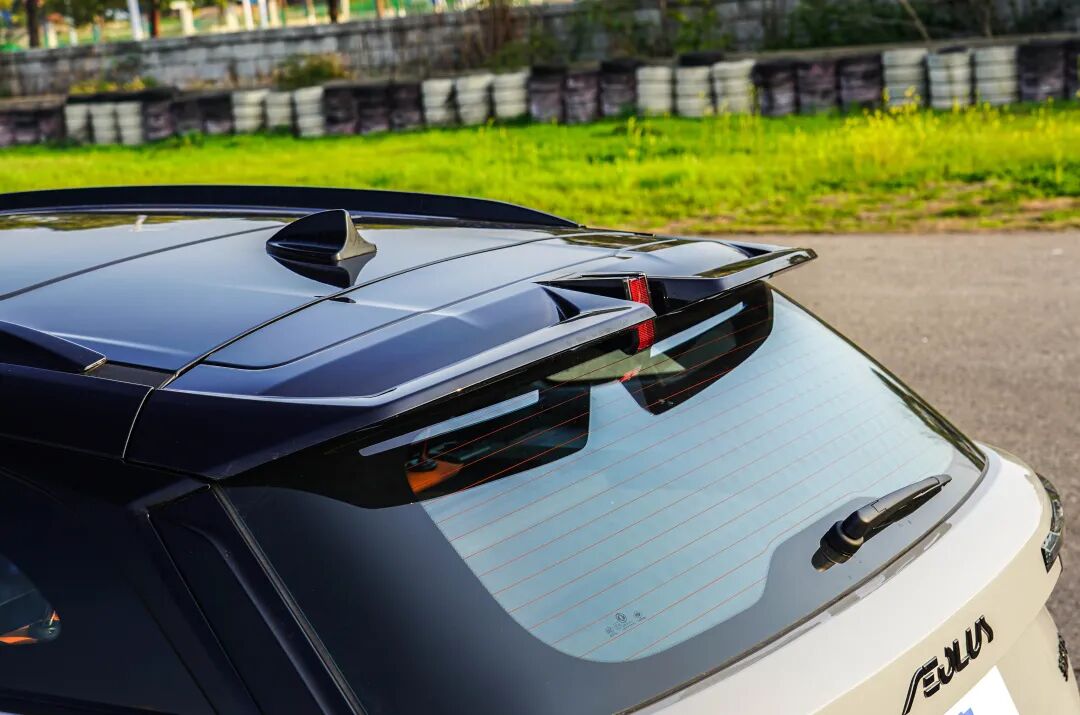 车尾相比车头的设计略显素雅,但能看出整体是在极力的营造运动氛围,比如上方分段式扰流板、高位刹车灯、熏黑处理的尾灯组、橙色回旋镖装饰、双边四出排气装饰以及碳纤维纹理的扩散器,似乎和运动沾边的元素它都有。而遗憾的是时下流行的贯穿式尾灯未能出席。