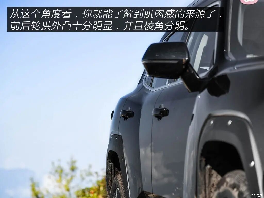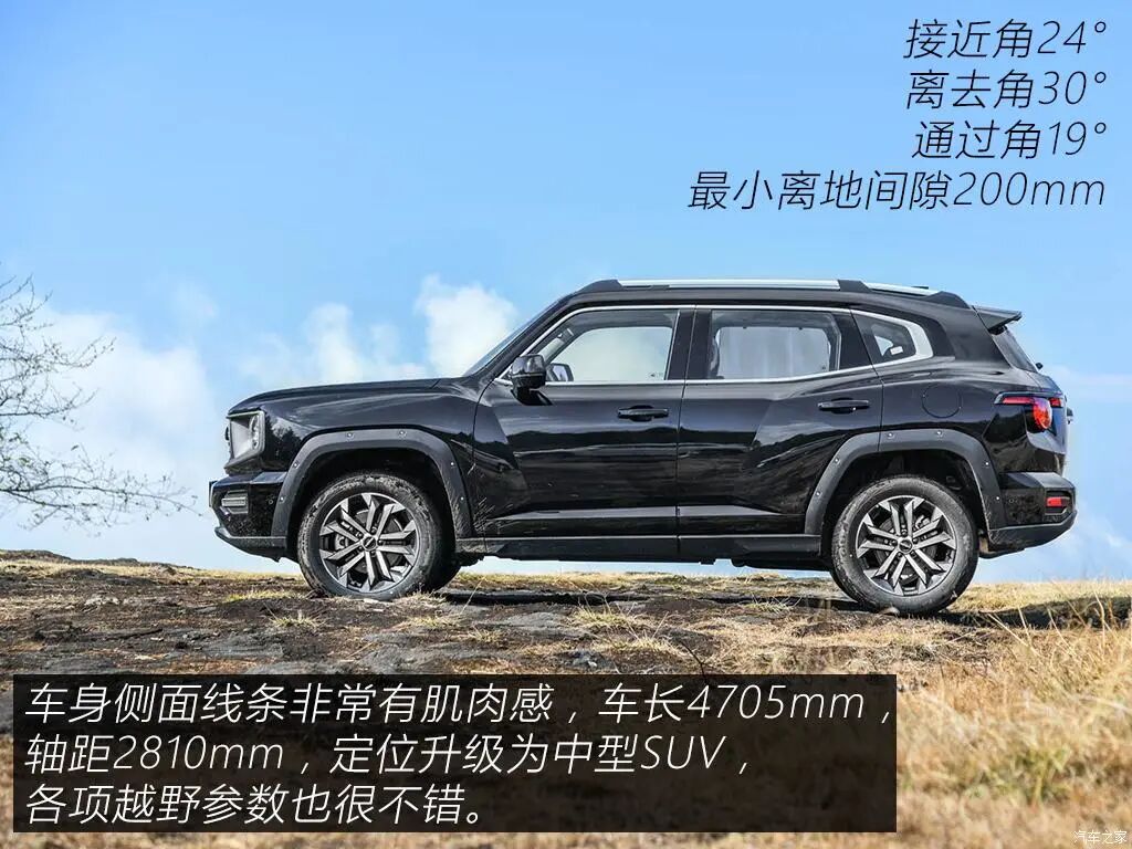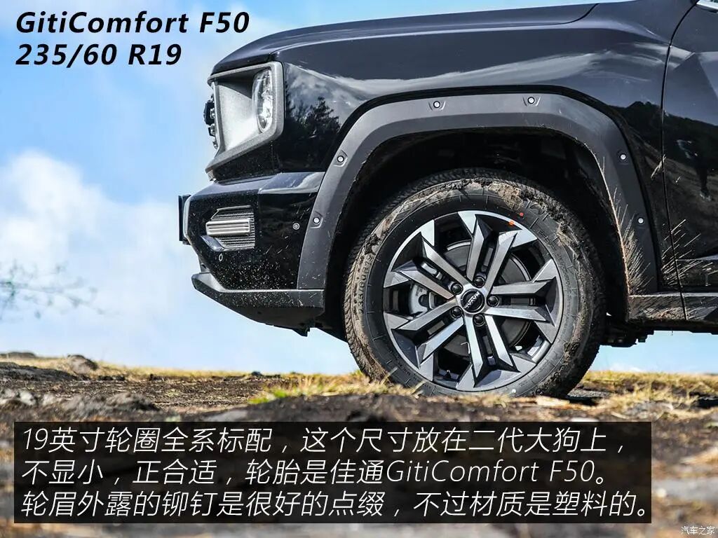车身尺寸的增加让二代大狗跻身中型SUV的行列,从侧面来看,轮廓和大狗是比较相像的,还是那种类似方盒子的造型,并且肌肉感十足。细节方面,轮眉处出现了外露铆钉装饰,其实关注大狗的朋友都知道,大狗后来推出的追猎版,也有这种设计,所以不算二代大狗的首创。19英寸轮圈是全系标配,还是挺实在的。车尾方面相对常规一些,很饱满,立体感很强,排气使用了隐藏式,比较低调。