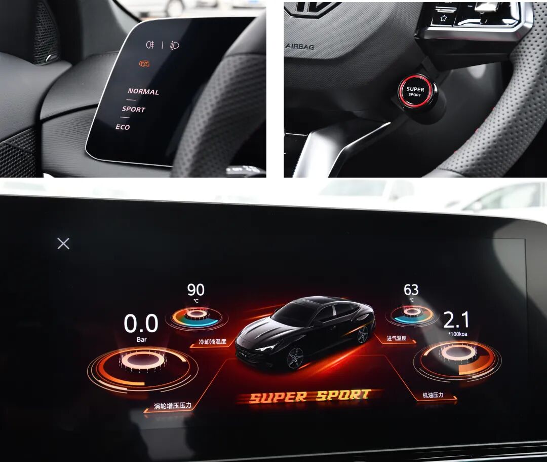 这台1.5T发动机也能让你有High tide的感受,而这则要借助SuperSport模式。切入后,发动机转速始终都会维持在2200rpm左右,同时油门踏板的响应要更灵敏,转向手感变得更重,排气阀门也会顺势开启,甚至在仪表上还会显示涡轮压力值、进气温度、机油压力等数据,不说别的,氛围感绝对拉满。