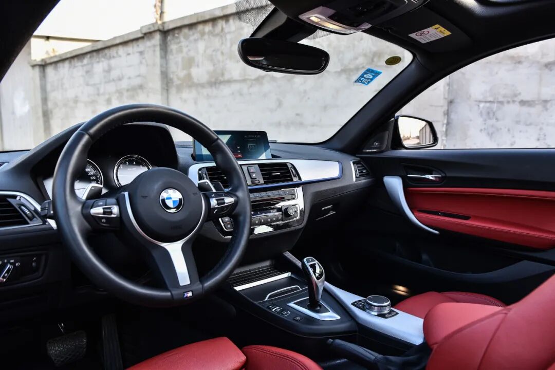 底盘代号为F22的225i车内有着明显的Old school味道,称不上精致,但也绝对并不寒酸。M运动车型特有的拉丝面板和蓝色饰条没有缺席,而红色的荔枝皮座椅堪称点睛之笔。