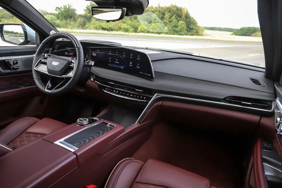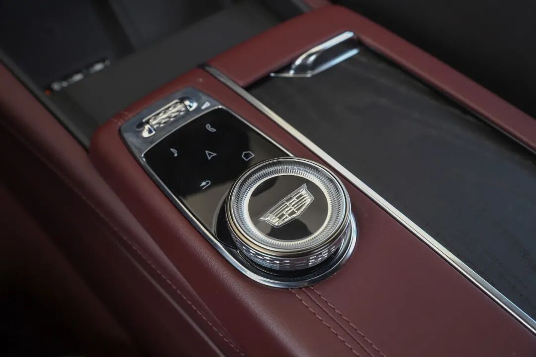 试驾车型座椅采用半苯胺真皮材质包裹,触感细腻柔软,菱形格纹之中还融入了凯迪拉克V型标识,档次感出众。前排座椅支持16向电动调节,头枕还加入了双扬声器,加热、通风、位置记忆功能也均有配备,后排也配备有独立空调和座椅加热。