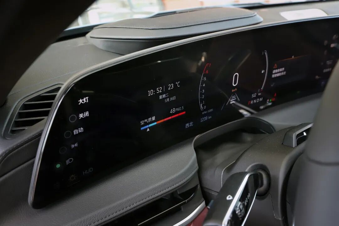 液晶仪表显示效果清晰,显示信息也比较丰富,行驶数据、多媒体、驾驶辅助、导航地图等都没有落下。仪表左侧触控按键可对仪表盘显示样式、大灯、抬头显示功能进行设置。