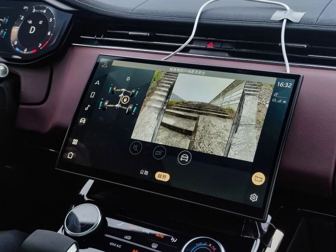 越野时选择清晰的车辆行进路线是非常重要的,揽胜运动版的全景影像系统提供越野视角,显示正前方以及两侧前轮的实时影像。在馒头包、岩石路等项目可以帮助选择行进路线,上陡坡时看着影像系统也会比看天空在心理上更有安全感。