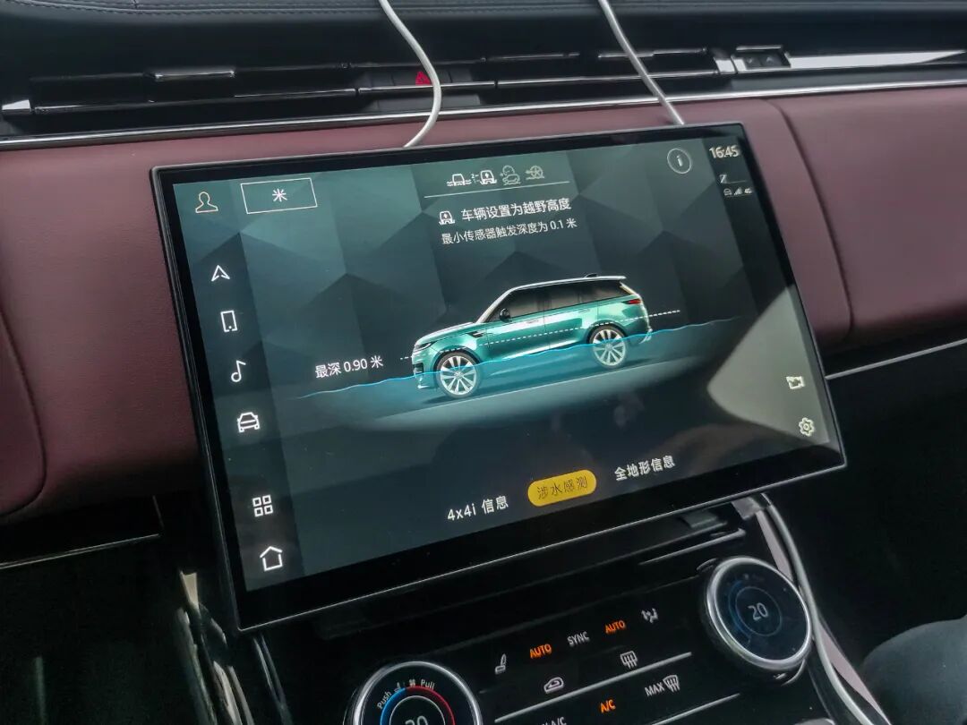全新揽胜运动版最大涉水深度达到900mm,切换至涉水模式发动机自动启停会关闭,涉水感测系统会显示水深和最大涉水高度线,直观显示车辆所处的状态,在车辆接近深水区时也会发出警告。