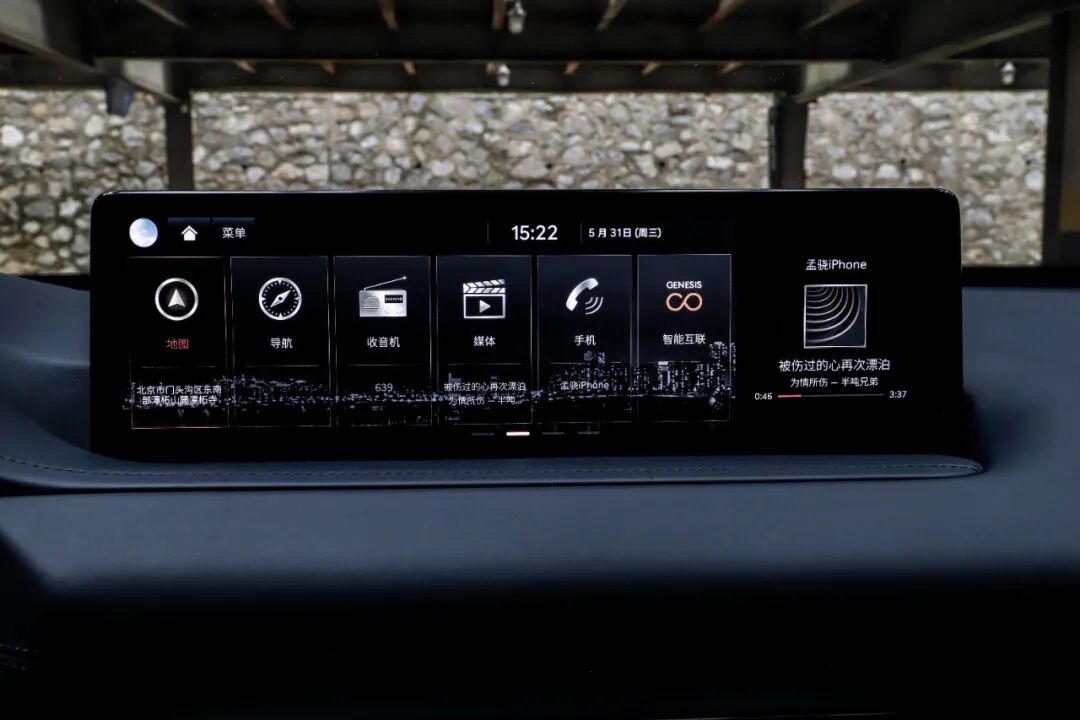 GV80的内饰风格与德系竞品来说完全不同,整体与雷克萨斯类似,呈现给消费者更多的是细腻的用料、精致的做工,设计灵感源自“留白之美“。大面积的Nappa材质、实木饰板、麂皮车顶这些都是这台GV80对于豪华感的最好诠释。