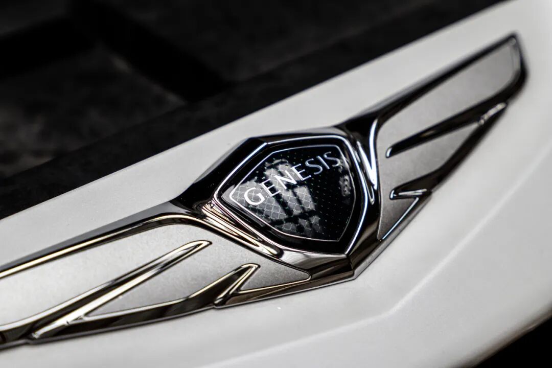 车尾门中央的内凹的设计叠加锐利的横向线条分割,进一步增强了设计上的层次感。硕大的“GENESIS”品牌标识位于两个尾灯之间,非常显眼。上下分层平行的尾灯组与前大灯相互呼应,点亮后视觉效果极佳。