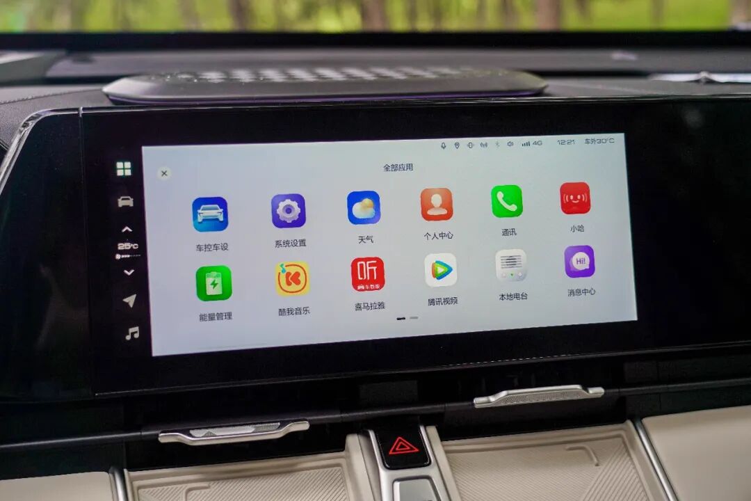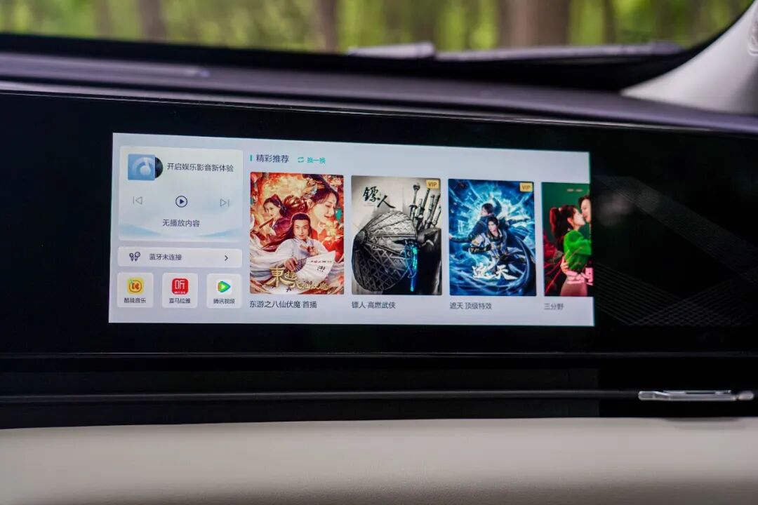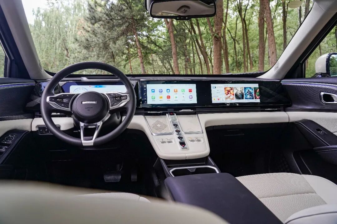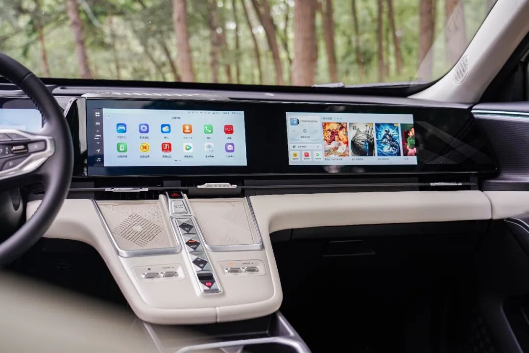 中控屏的尺寸为12.3英寸,其他两块屏幕如是,搭载骁龙8155芯片,内置全新一代Coffee OS系统,整体的使用感受与新势力产品别无二致。副驾大屏主要工作是服务娱乐性,支持蓝牙耳机连接,这样一来可以做到主副驾互不打扰。
