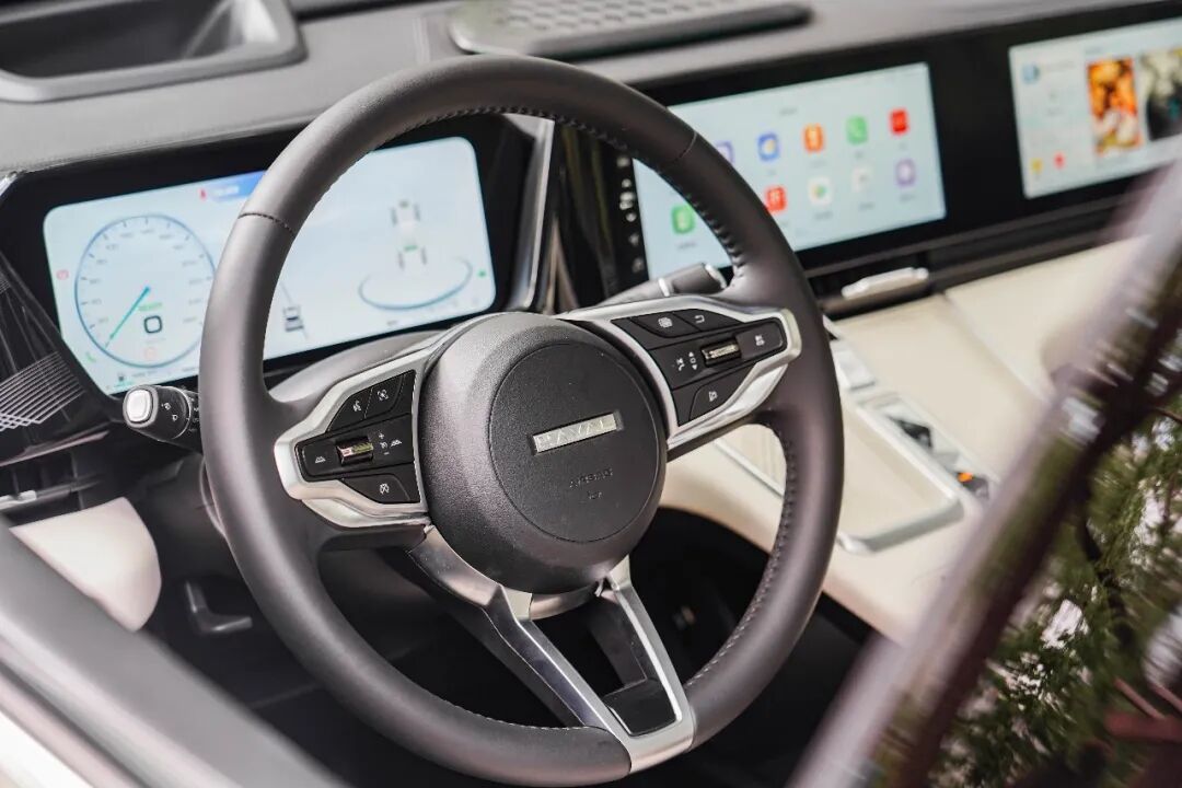 皮质方向盘尺寸相比于H或是狗系列车型要小不少,用料手感细腻,功能按键布局也属于易上手的类型,如果握环能再饱满一些就更棒了。