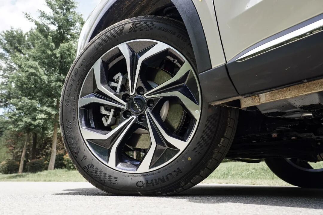 双色花瓣样式轮圈质感不俗,尺寸给到了19英寸,轮胎采用的是锦湖ECSTA PS71系列,可谓是轮胎届的“六边形战士”,具体规格为235/55 R19。