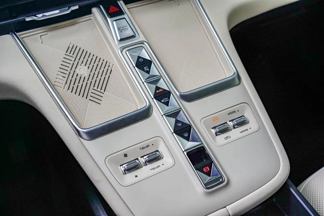 中控岛台是笔者最喜欢的地方,采用了大量对称设计,具有很强的设计感,尤其是中间的按键带。手机无线充电功能也要给个好评,50W快充且底部带有散热装置。