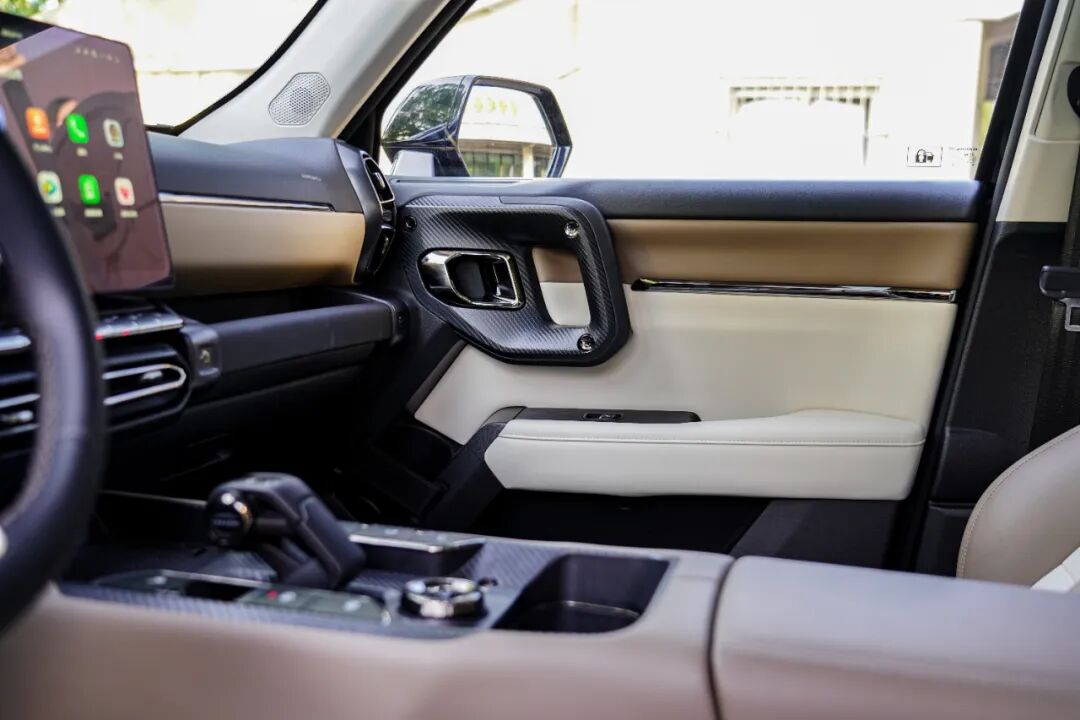 门板处的设计个人比较喜欢,拥有铆钉、碳纤维纹理材质、皮革、粗壮的门把手,诸多元素的碰撞带来了极为复合的视觉效果,硬派中透露着细腻。