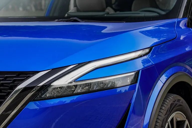 大灯组采用了不规则设计,造型纤细且锋利,使得前脸的造型看起来更加富有攻击性,而该部分也可看做"V"形中网的延伸。上半部分为示宽灯和LED日间行车灯,下方为大灯,由12颗独立LED光源构成,可以根据路况自动调节个别灯组的开闭,保证提供充足照明同时不影响其他道路使用者。