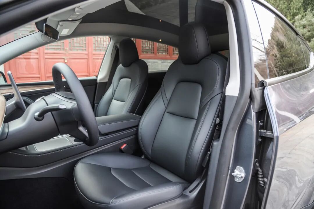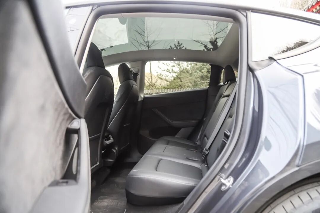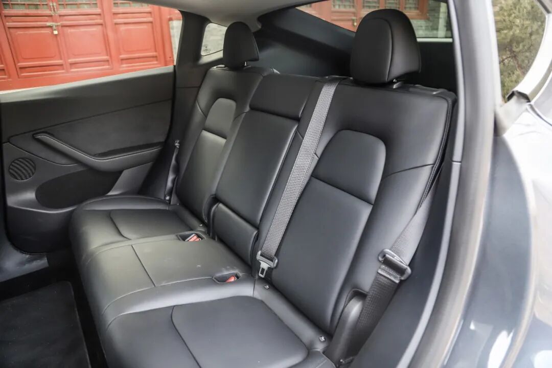 后排座椅支持靠背角度调节,可放到更躺的角度。和前排座椅相比,后排座椅内部的填充物更硬一些,且座垫对腿部的承托性不足,乘坐舒适性有所折扣。相比Model 3,Model Y的后排乘坐空间改善不少,头部和腿部空间更为富裕。