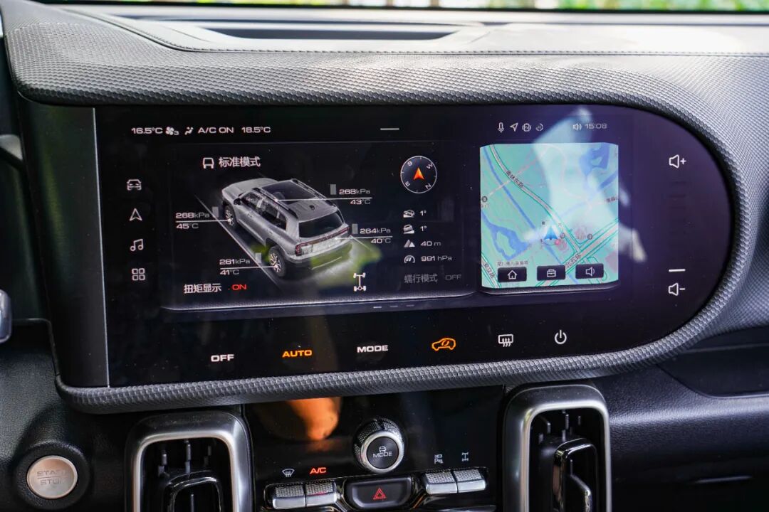 试驾车型搭载了一台2.0T发动机,最大功率175kW,最大扭矩385N·m,匹配长城自研的9DCT变速箱,还配有多片离合中央差速器结构和后差速锁。硬件部分没得说,相比普通的城市型SUV也要硬核一些。
