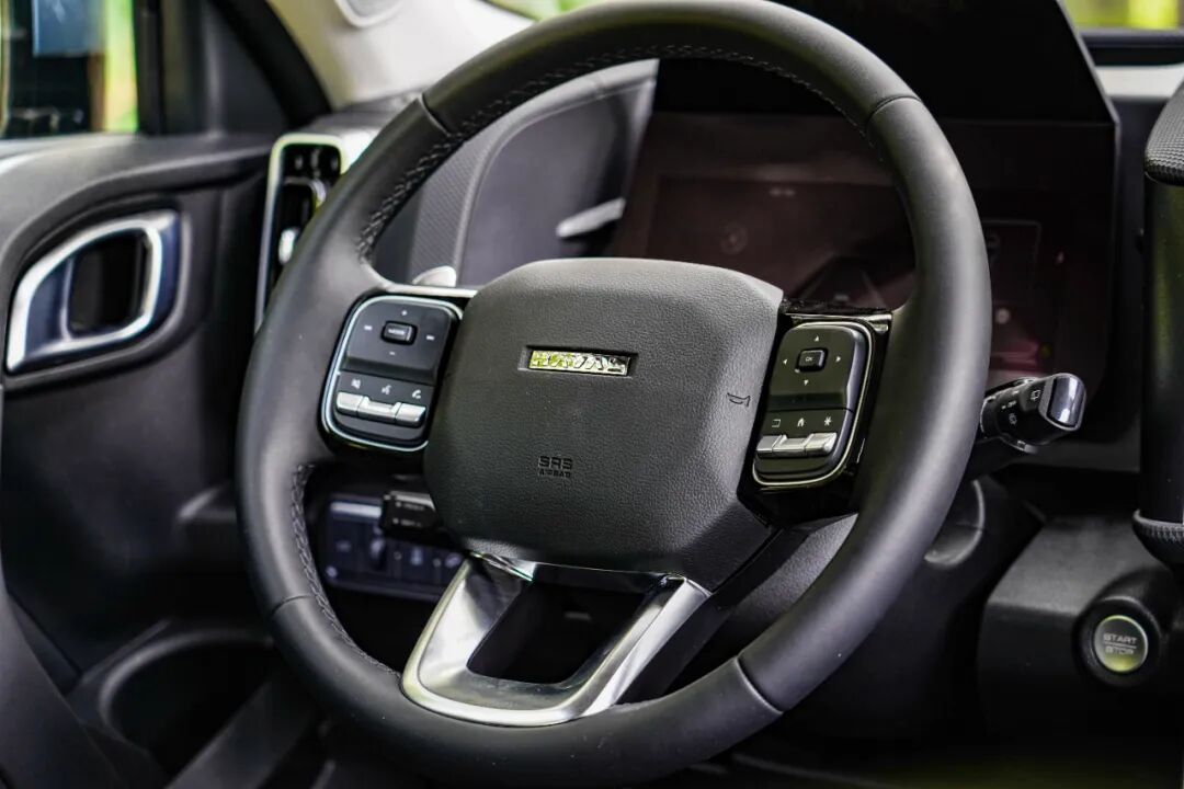尺寸偏大的三辐式多功能方向盘,一看就是哈弗的车型,并且握环也很粗壮,是硬派车型该有的样子。材质为皮革,手感还算细腻,除了大无可挑剔。