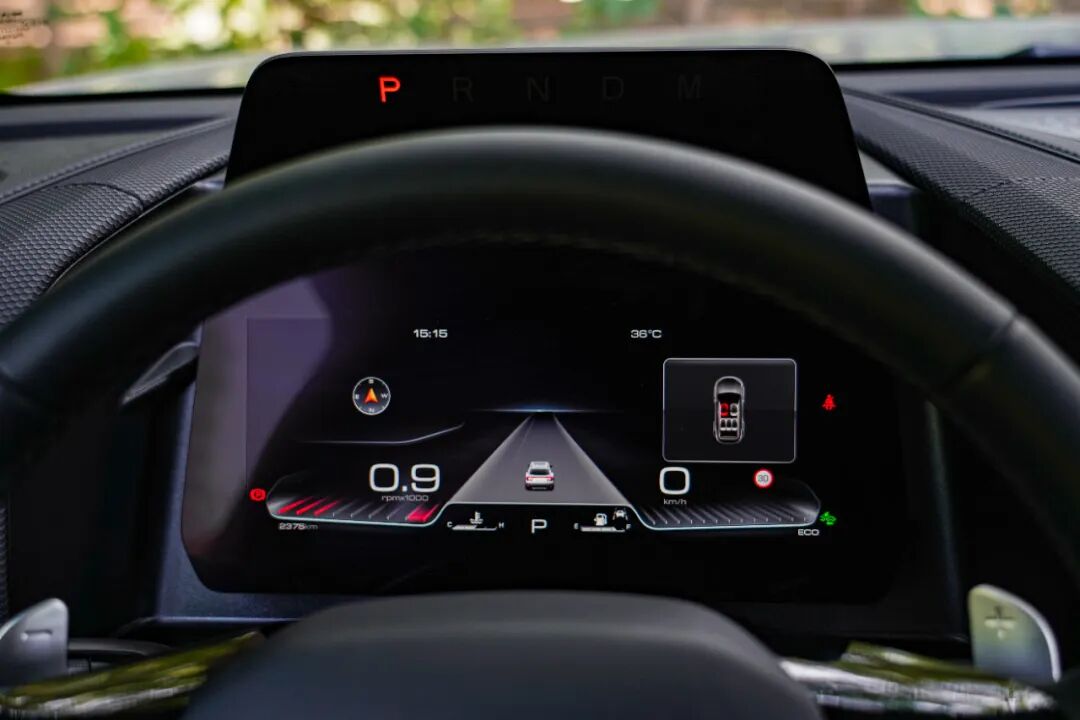 液晶仪表造型设计不乏看点,上面酷似帽檐的位置是挡位显示区域,下方是全液晶屏则是车辆相关新车的载体,UI设计挺简洁的,功能区域划分也足够清晰,属于实用的类型。
