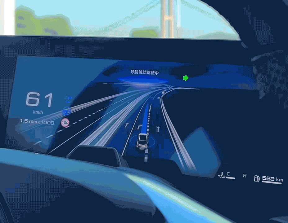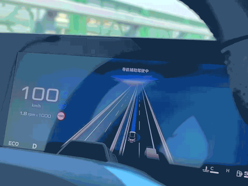 在高精度地图覆盖的高速路段,按下方向盘左侧的方向盘标识按键便可一键开启NGP功能,开启之后仪表盘会进入领航界面,显示车道以及周围车辆等信息,利用方向盘的拨杆便可调节巡航车速和跟车距离。