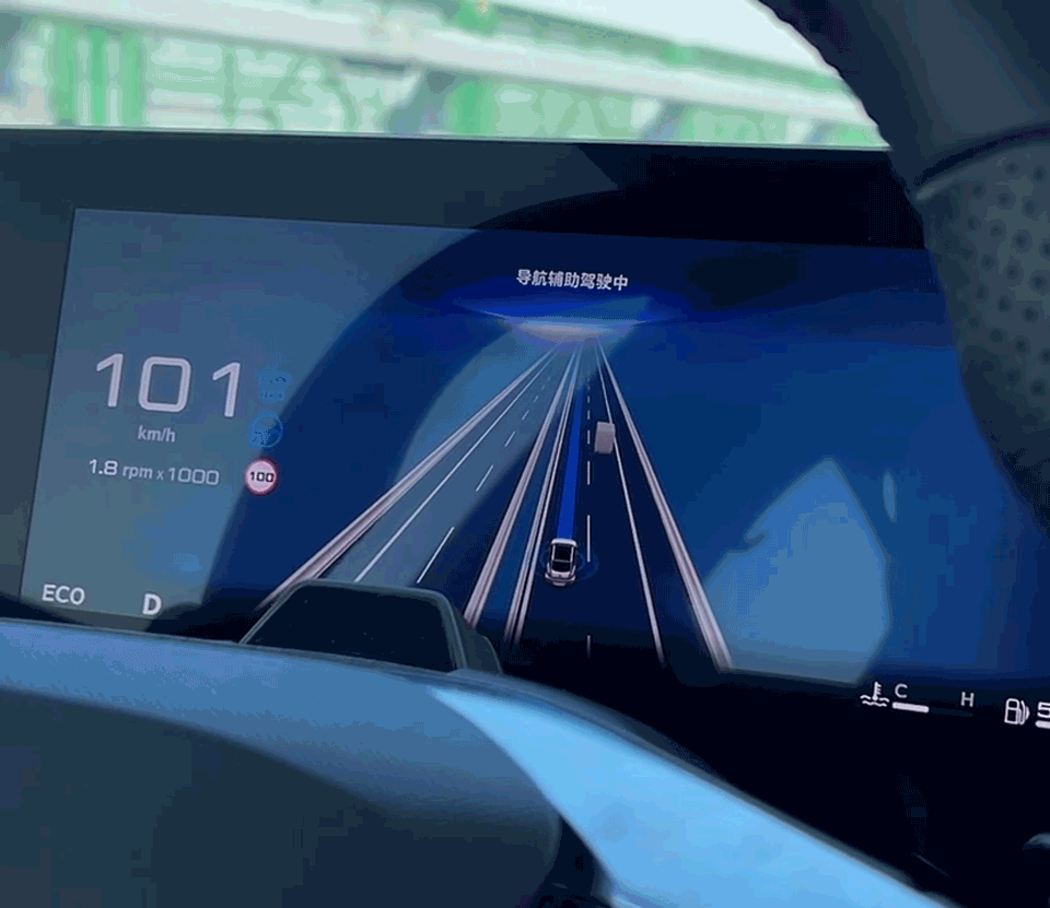 如果前方遇到慢车,车辆也会自主决策伺机超车。同时支持打转向灯变道,在驾驶员打转向灯后,车辆感知周围无碰撞危险的情况下,会执行变道操作,从打灯到变道完成的过程并不拖沓,变道过程也比较丝滑不突兀。此外在后方有车辆逼近时,仪表盘会有追尾提醒。