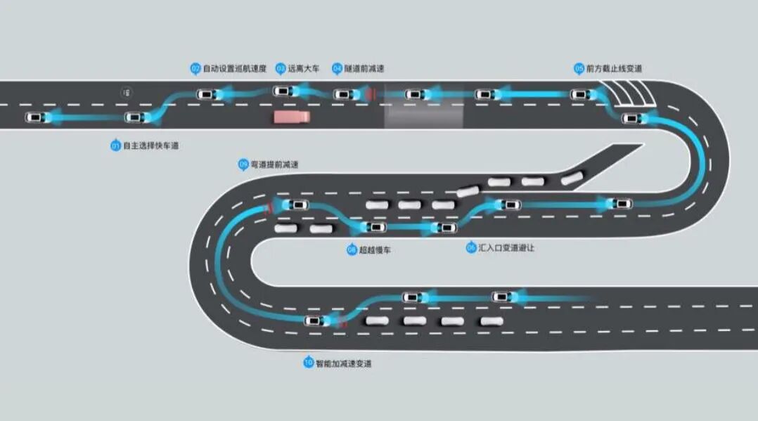 MG NGP系统可以实现自主选择车道、自主设置巡航速度、远离大车、隧道前减速、前方截止线变道、汇入口变道避让、变道超越慢车、弯道提前减速、智能加减速变道等操作。