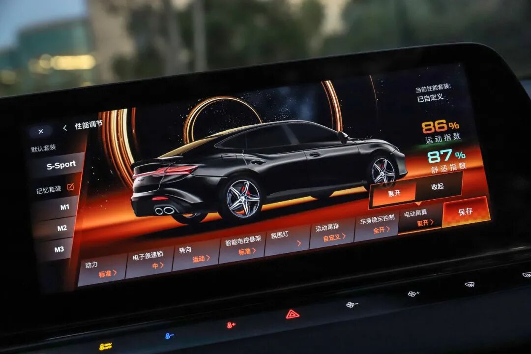 悬架采用前麦弗逊+后多连杆的组合,并配备有E-LSD和mCDC功能,悬架标定其实更偏运动,ECO和NORMAL模式也会感觉到一定路面反馈,当然不会是硬核性能车那种感觉,路面小的细碎颠簸会得到妥善处理。切SPORT模式之后,底盘悬架会更紧绷,富有支撑性且路感更加清晰,动态响应更灵活干练。