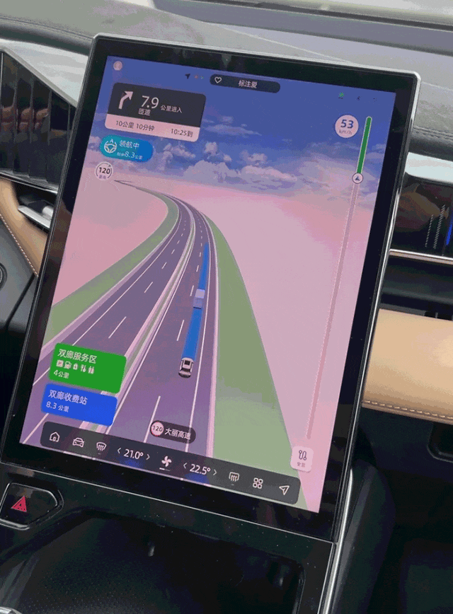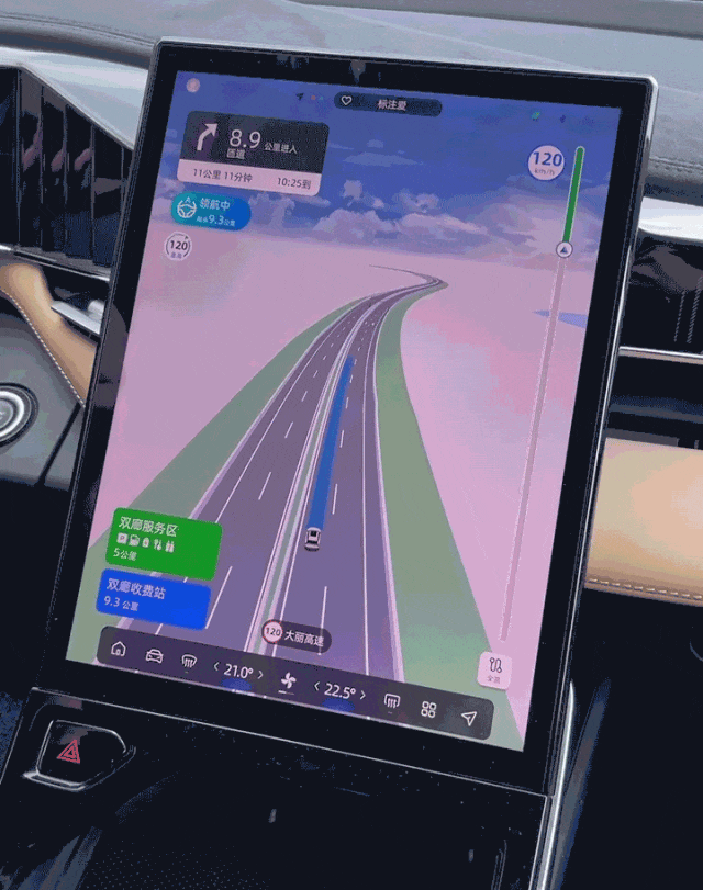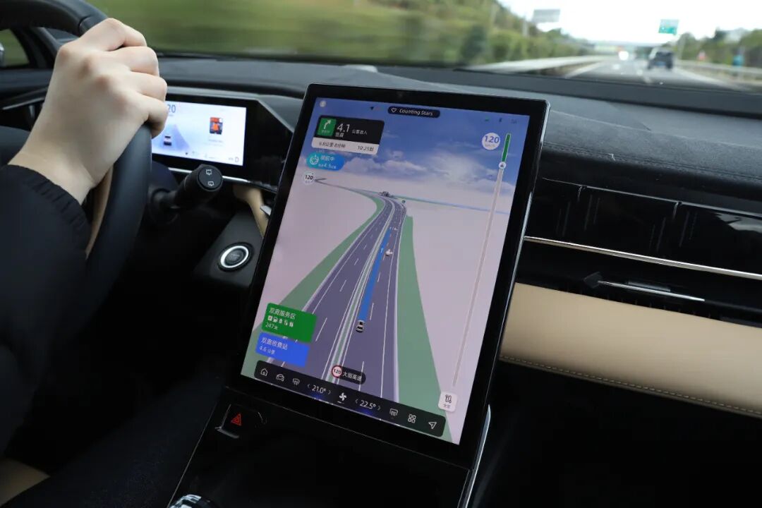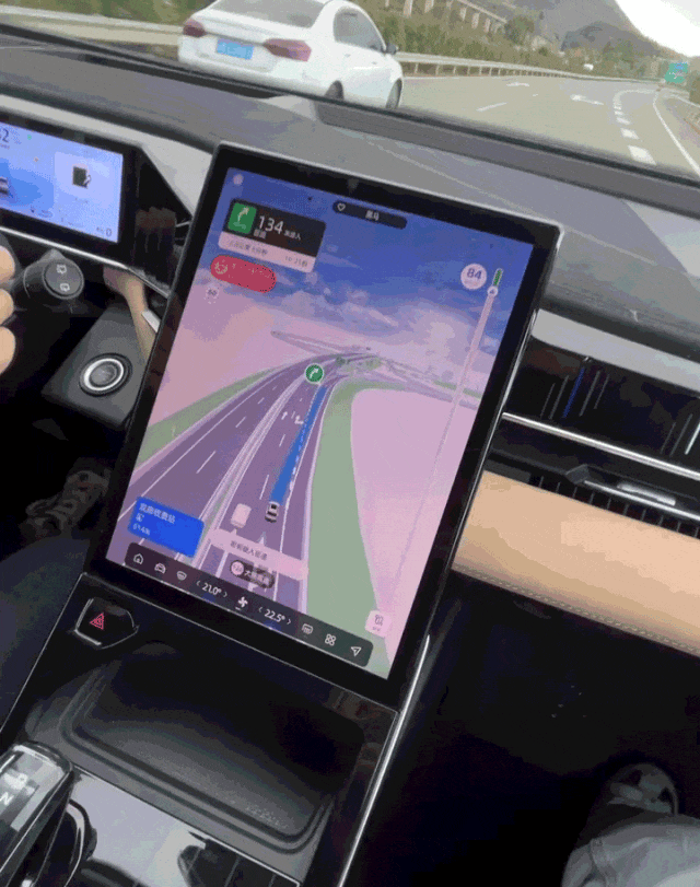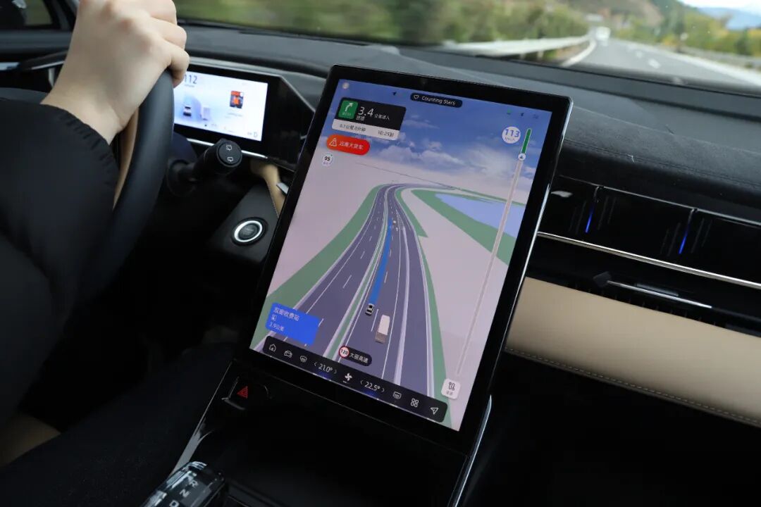 实际体验中,在匝道内就可进入高阶领航模式,由匝道进入主路后,当传感器识别无其它车辆影响后,会选择依次并入最左侧快车道,并按照道路限速行驶。在45-130km/h的速度区间,系统支持拨杆变道,在打转向灯后,感知设备识别前后方有足够空间和时间差时会执行变道操作,转向过程比较顺滑舒适,不会一打转向灯就突然转向,不会给车内驾乘人员造成紧张感。