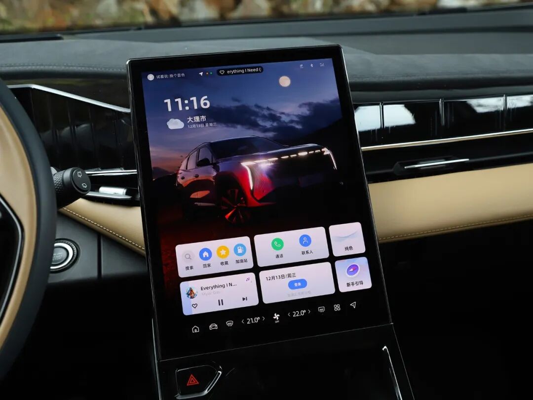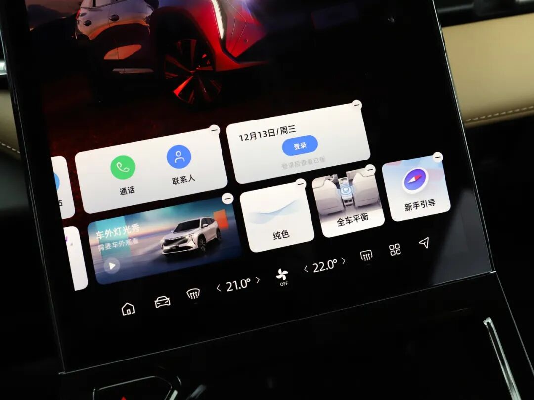 在操作交互层面,桌面和负一屏增加卡片组件,能自定义选择显示天气、日程、氛围灯、360全景等功能信息,并且卡片位置可调。系统还新增8种控制手势,可以进行返回、打开控制中心、任务中心、调节音量/空调等操作,与平板电脑操作逻辑基本无异。此外,分屏功能可同时显示导航、音乐等界面。