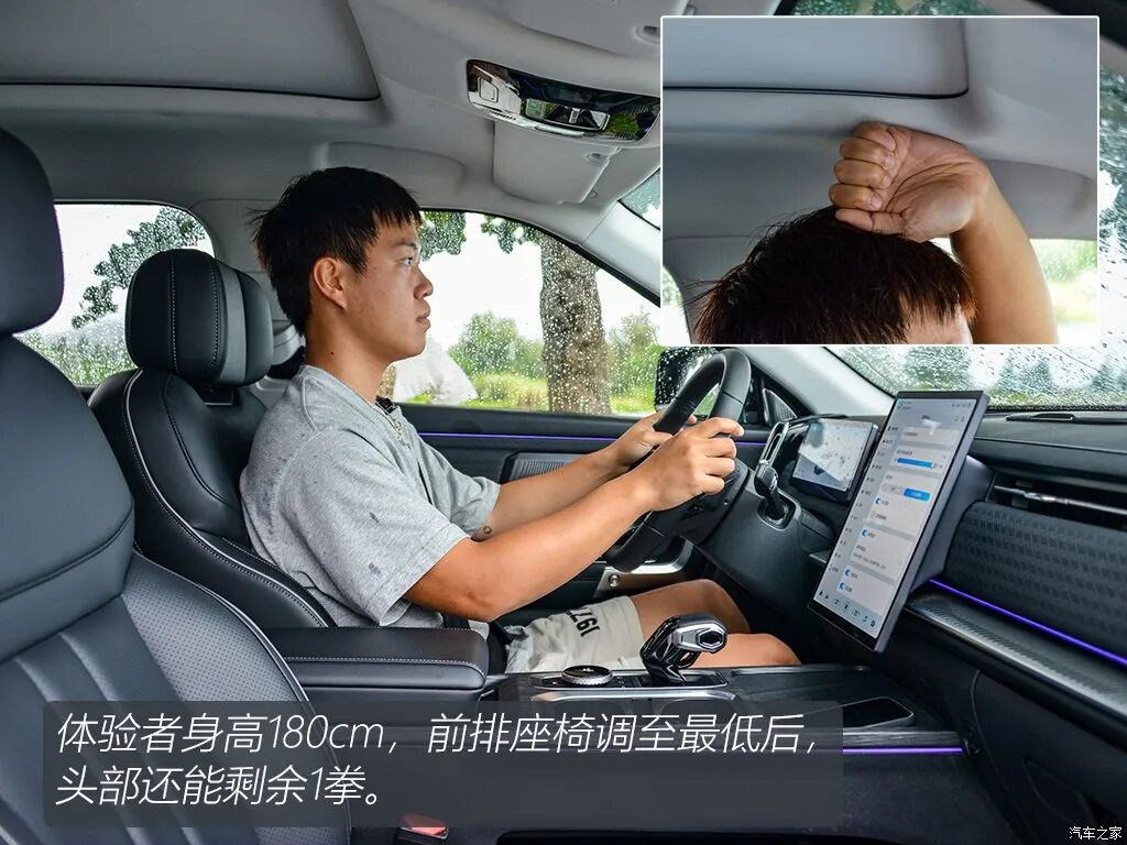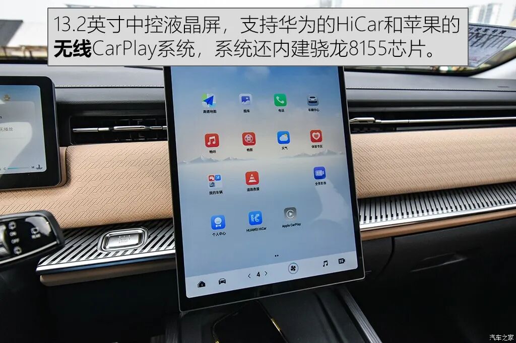 前排主要就是两块屏,分别是10.25英寸的全液晶仪表盘,还有一块竖置13.2英寸中控液晶屏,并且还带有HUD抬头显示。影音娱乐系统支持华为的HiCar和苹果的CarPlay系统,并且搭载晓龙8155芯片,支持OTA升级,可说是除了动力来源不是电动车,整个车机系统都尽可能地向新能源车看齐。不过我个人觉得如果中控台上能够多一点实体按键会更好,因为实体按键才是最方便迅速的操作方式。