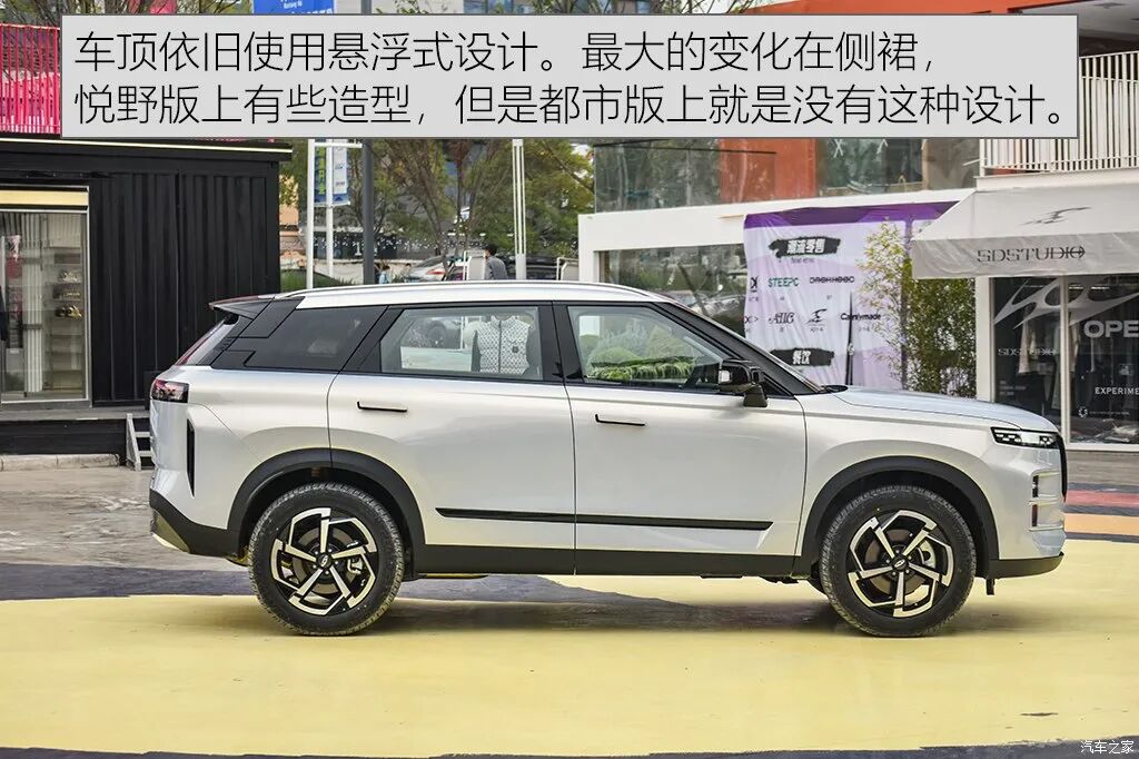 都市版车型依旧采用悬浮式车顶的设计,门把手也是隐藏式的。隐藏式门把手前几年很流行,但是现在好像又有些车厂回归到传统把手上。其他部分倒是区别不大,只有轮圈配色稍微有些不同,还有侧裙的造型比较平实一些。尺寸方面,车辆的长宽高分别为4500/1865/1680mm,轴距为2672mm,长宽和悦野版相比小了一点,估计是造型所造成的区别,而轴距则是未变。