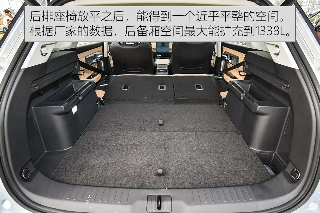 后备厢空间,不管是四驱车型还是两驱车型,容积都一样,都是410L-1338L,没有因为四驱系统而损失任何空间。而且后备厢空间非常规整,装载空间也有一些弹性设计,实用性高。第二排坐垫放倒后,可以形成一个纯平面,如果在野外不想搭帐篷的话,可以在里面小睡一下。