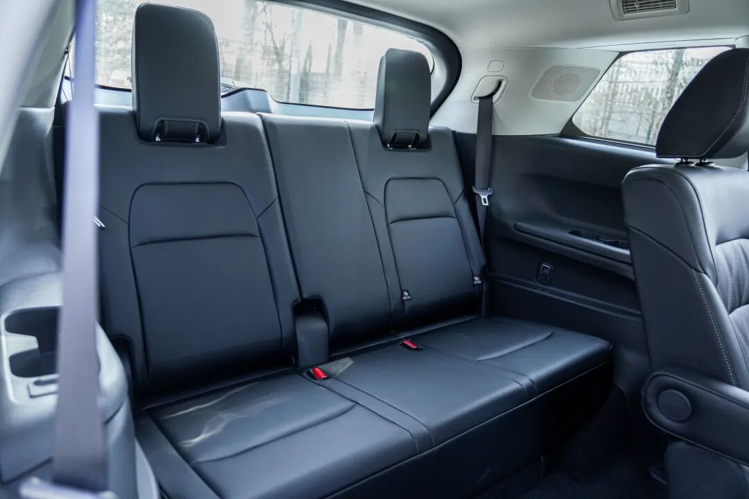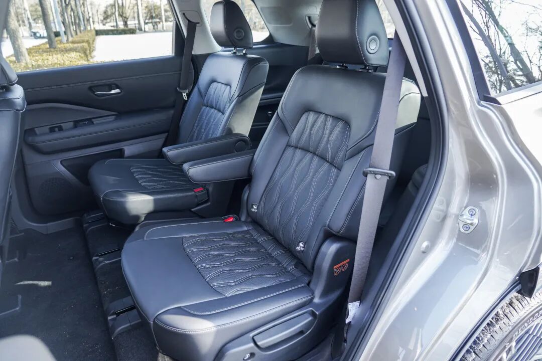 二排两张独立座椅,虽不及MPV车型那般尊贵,但已经领先竞品了,体感称得上是两张大沙发。座椅前后可移动调节140mm,靠背角度10挡可调,最大可达到 115°,座椅加热范围也覆盖到了腰部。空间方面,腿部是充裕的,只是头部对于大个子朋友来说不算友好,因为底盘设计的缘故,二排座椅被放置在了一个高度有70mm左右的地台上了。