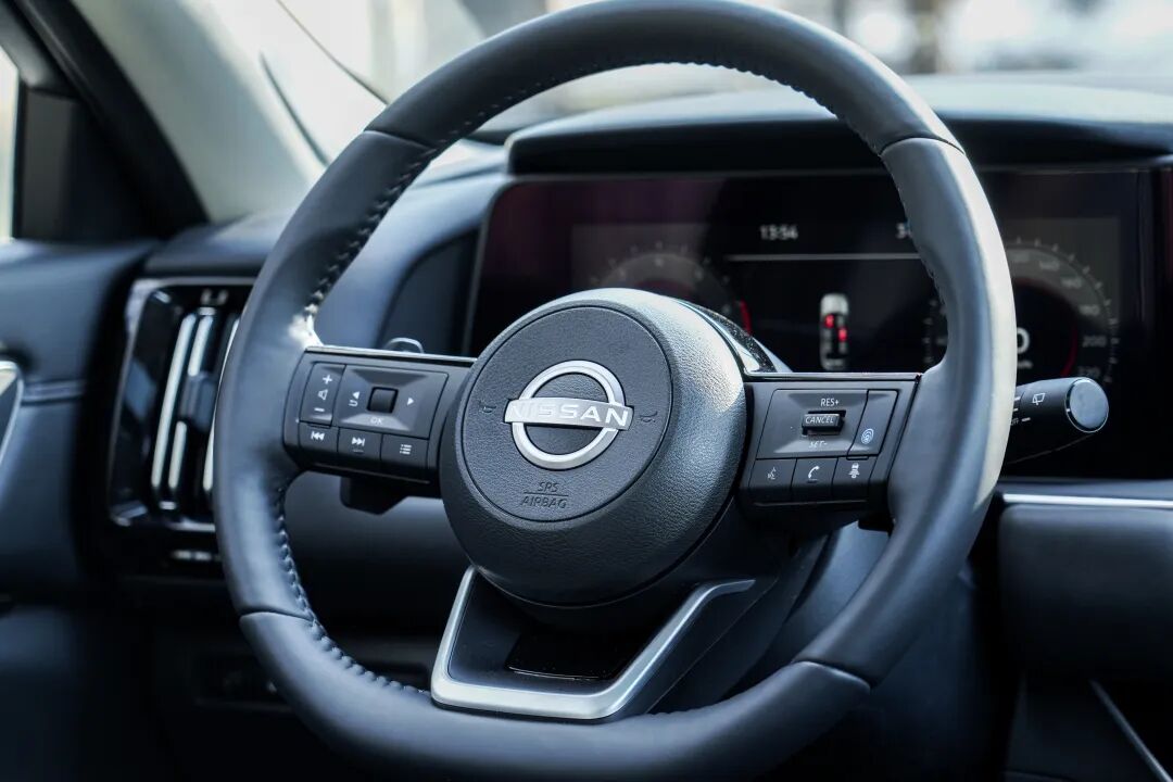 方向盘尺寸适中握感很好,所采用的皮质细腻,造型和按键布局同奇骏一致,试驾车型还配有电动调节和加热。