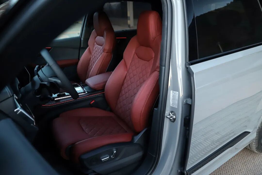 座椅采用华格纳真皮材质包裹,靠背带有S压印,再辅以菱形缝线,品质感运动感兼顾。前排标配加热通风,座垫长度支持调节,而且座垫和靠背的侧翼都可以调节松紧程度,以适应不同体型的人群,给予合适的包裹性。