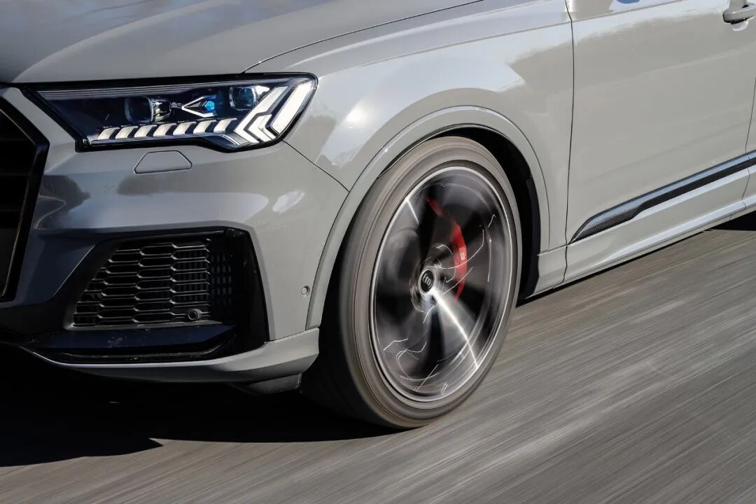 踩刹车按下启动键,十字曲轴V8发动机散发出浑厚迷人的声浪撩拨你的心弦。挂D挡出发,你只需轻点油门踏板便可从容提速,与之相伴的还有咕噜咕噜煮水般低沉浑厚的声浪,简直不要太有感觉。奥迪SQ7的动力储备没得说,力大砖飞,极速可达250km/h,日常驾驶后段的1/3油门行程基本没有出场时间。强大的动力也需要出色的刹车系统与之匹配,前对向六活塞固定卡钳带来出色制动力。