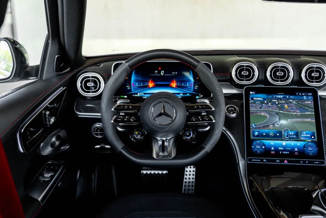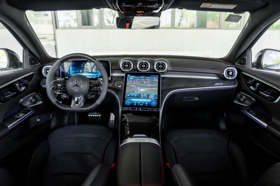 进入车内,依旧是熟悉的全新C级布局,毫无疑问你可以永远相信奔驰的设计,再加入红色缝线与AMG碳纤维饰件,整体氛围感进一步提升,特别是在氛围灯点亮后。相比竞争对手,相信内饰将成为不少人购买C 43的一大理由。