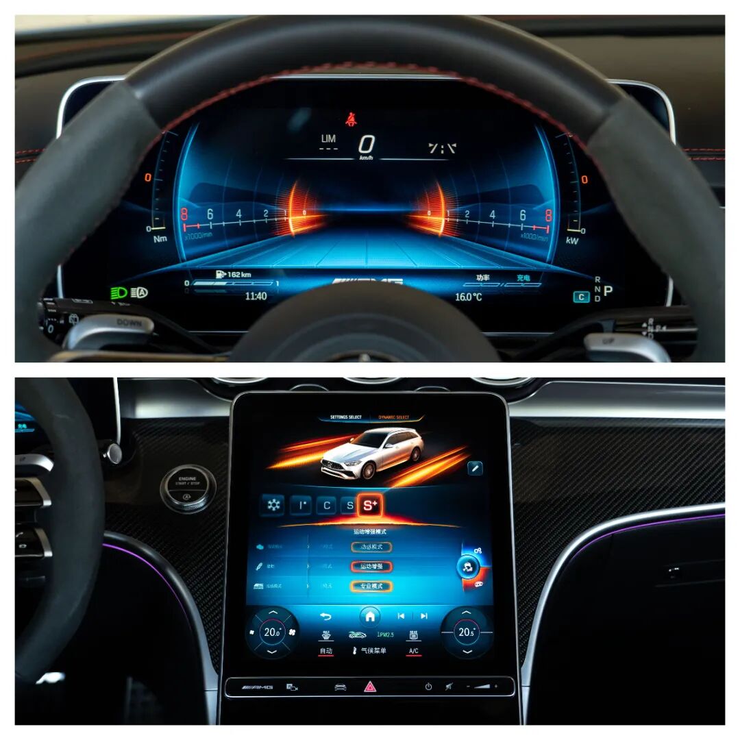 后方的12.3英寸全液晶仪表盘支持AMG主题,更清晰的挡位显示与更合理的布局,相比要素过多的运动主题要好上不少;MBUX系统内置的“性能表现”界面可显示内容没有C 63 S那么丰富,但涉及动力系统、车身与悬架工况的数据也一样没少。