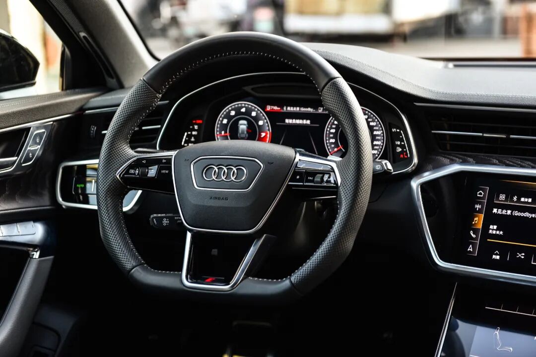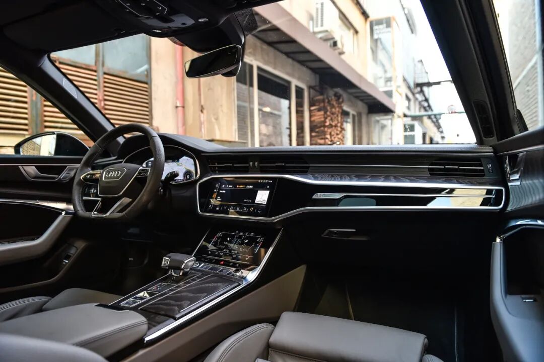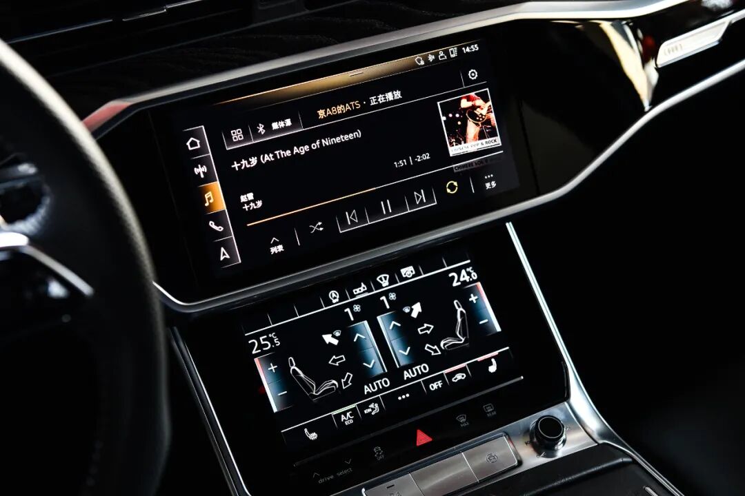 车内其实与奥迪A6L保持了保持高度一致,只不过在细节地方的用料有所不同。中控台处浅色的暗纹木饰板极大程度的提升了车内的豪华氛围,与米白色的座椅搭配在一起,透露出了典雅的格调。