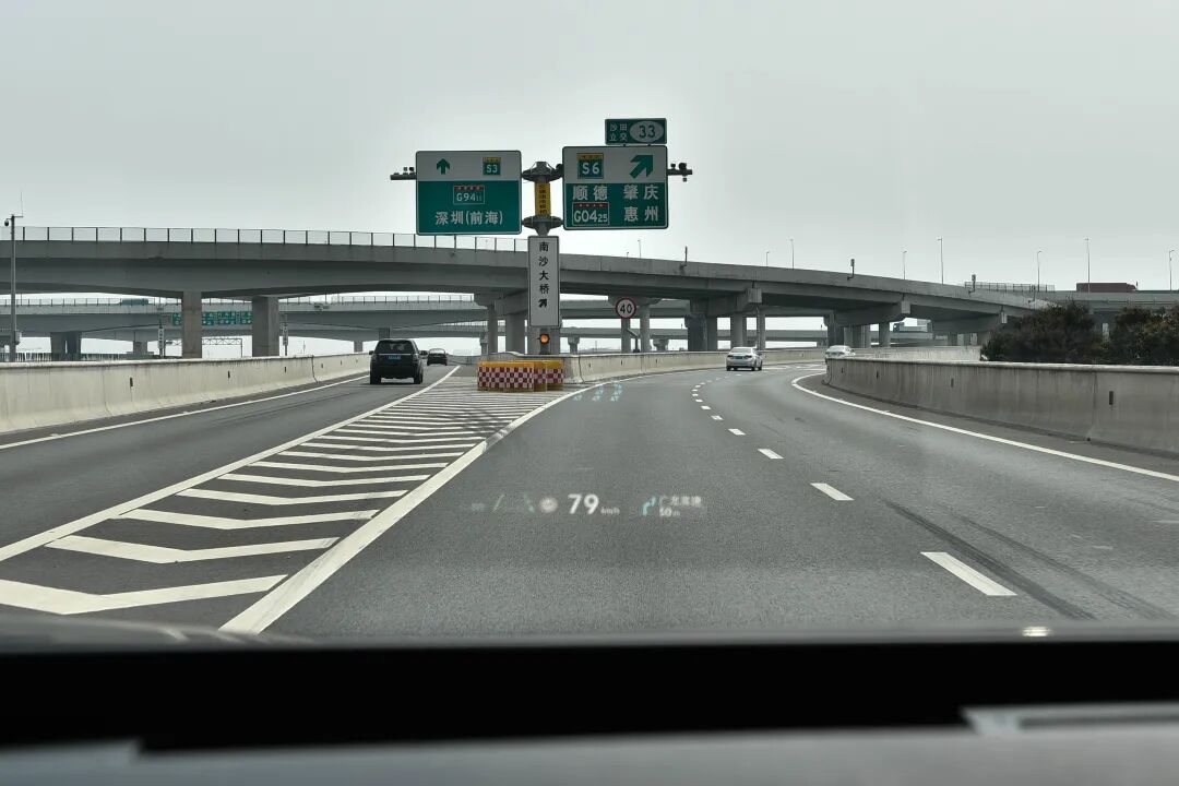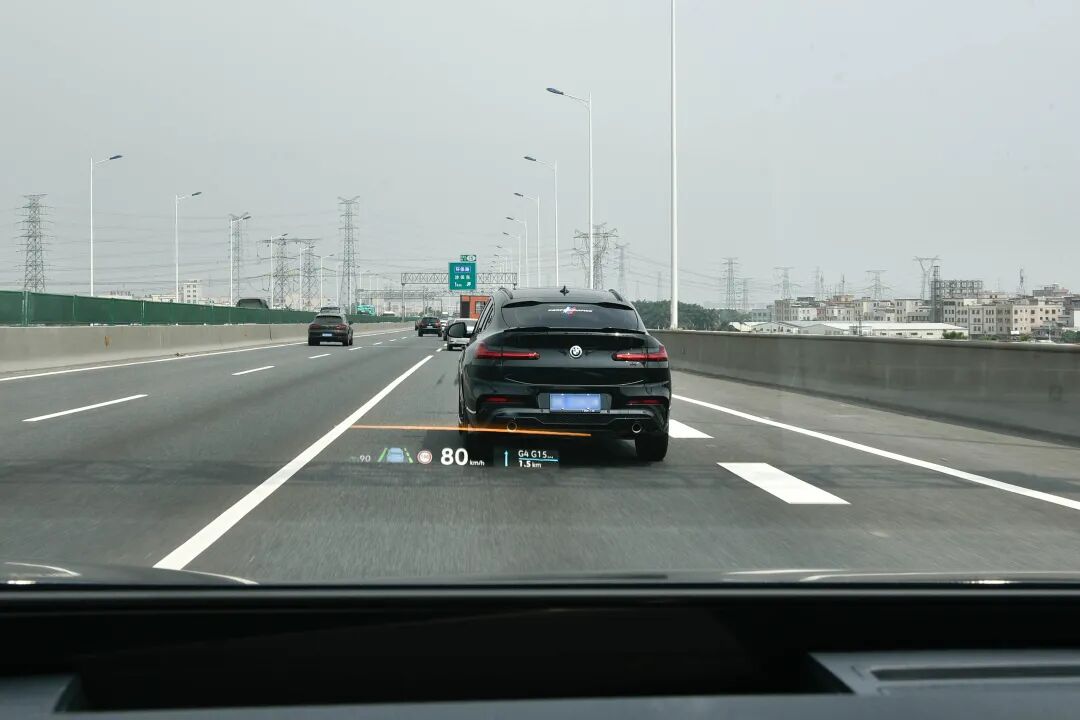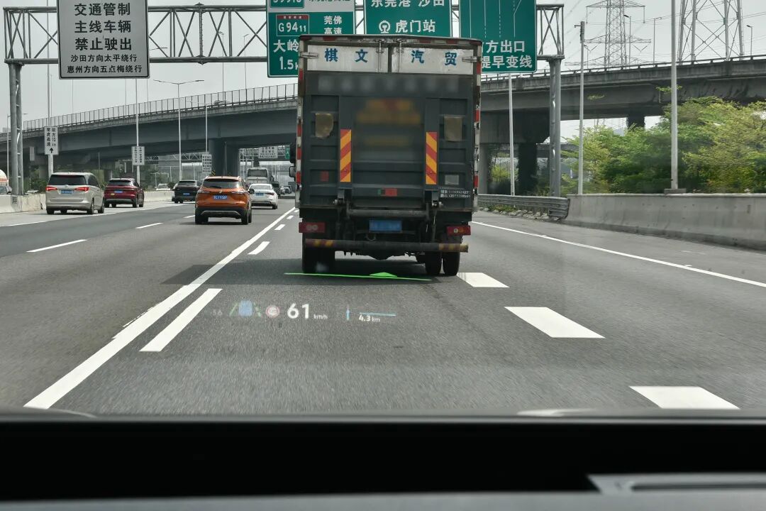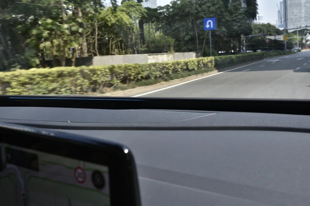 AR-HUD则是另一项新颖的功能,通过增强现实技术与抬头显示进行结合,从而直观的将导航标识“显示”在前方路面上。如下图所示,导航时,道路前方有向右侧转弯的三枚蓝色箭头指示(实际观感比照片中的要更强),并且该箭头也会随着车辆前行而“靠近”我们,初次体验有种“扑面而来”的感觉,十分有趣。