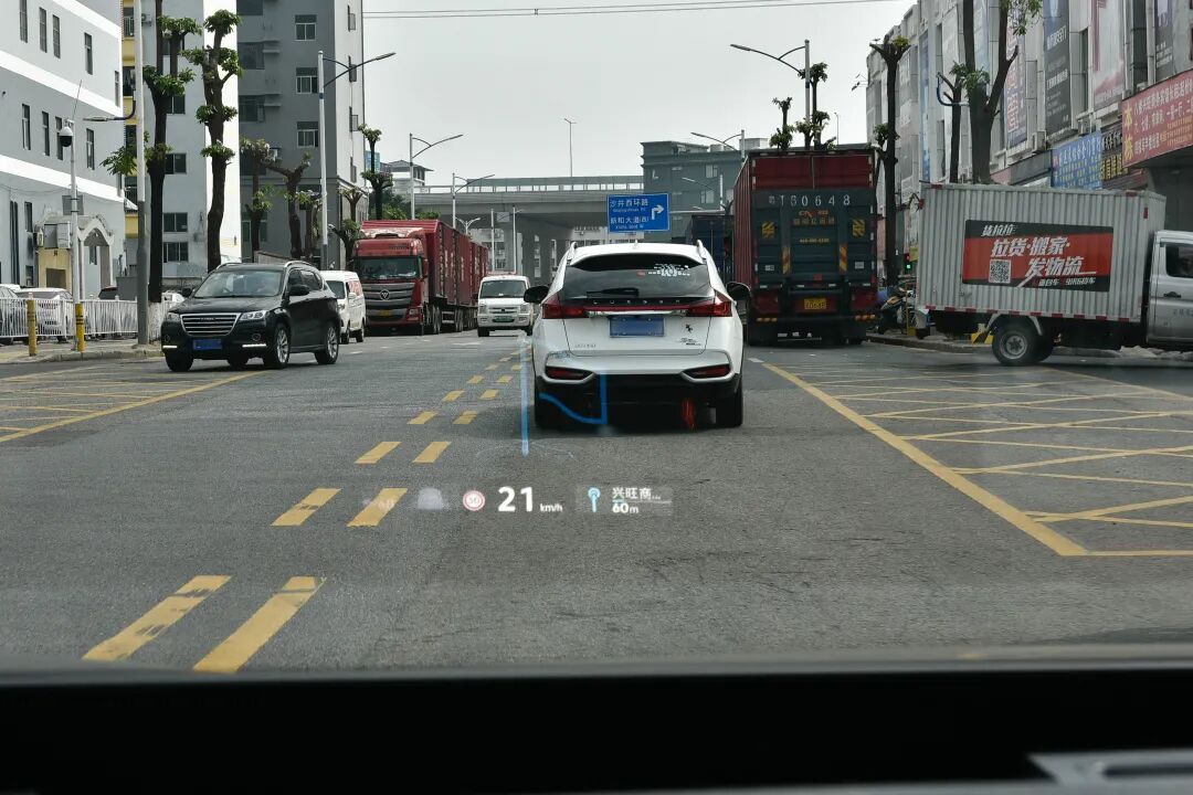开启自适应巡航功能后,这套AR-HUD还会自动识别周围车辆并提醒驾驶者跟车距离,距离过近呈现黄色,距离合适则为绿色,提示线的位置也会随着前车位置的变化而变化,从而实现更精准的识别前方车辆。值得一提的是,到达终点之后,道路中央还会呈现小旗子的标识,真有种玩游戏的感觉。