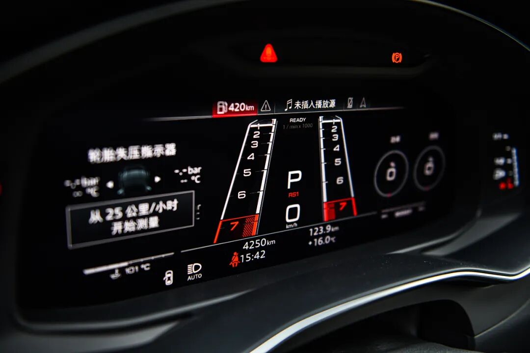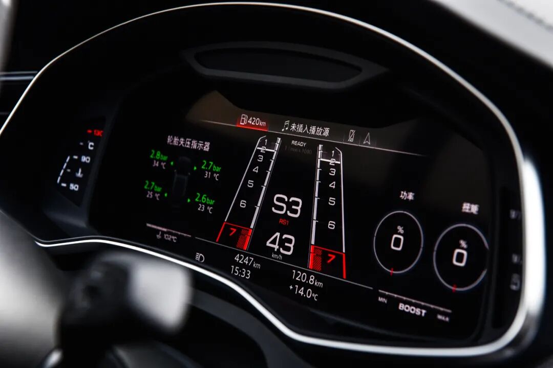 全液晶仪表除了与其它奥迪车型相同的显示效果外,还提供了RS模式,拥有更丰富的基础信息,而在清晰程度以及操作的逻辑方面,奥迪的虚拟座舱在业内都具有较高的水准。
