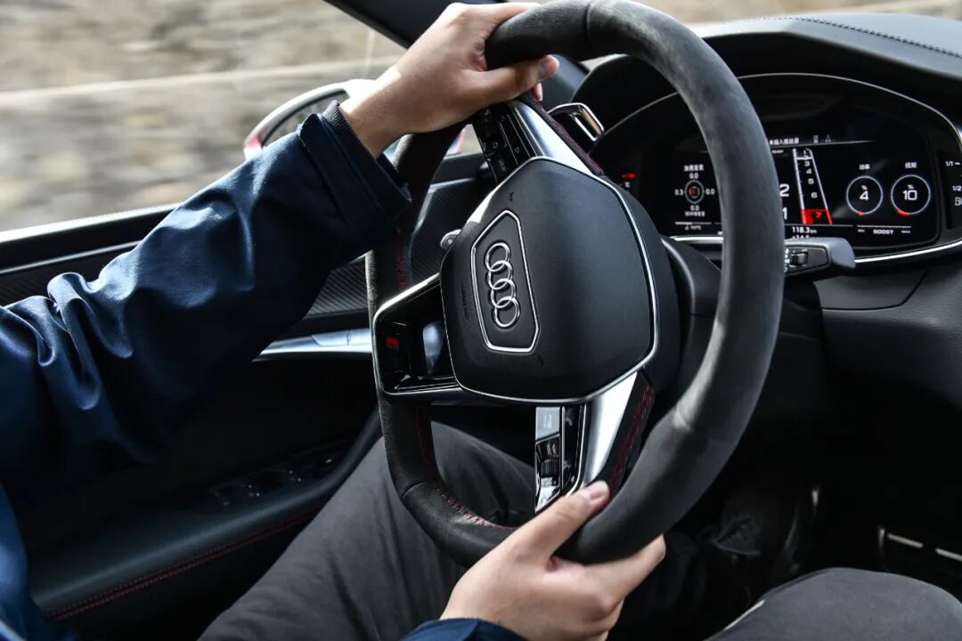 精准的转向是这台RS 7的神秘武器,在可变转向比的加持之下,方向盘从左打至右只需要两圈多一点,指向性十分精准,车头很灵活,使车身呈现出了很小的体量感。不过这台车的转向阻尼力度依旧偏轻,在激烈驾驶中缺少了一些给予驾驶员的“安定感”。